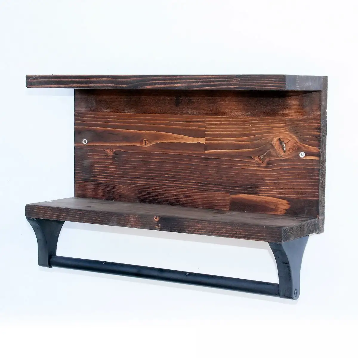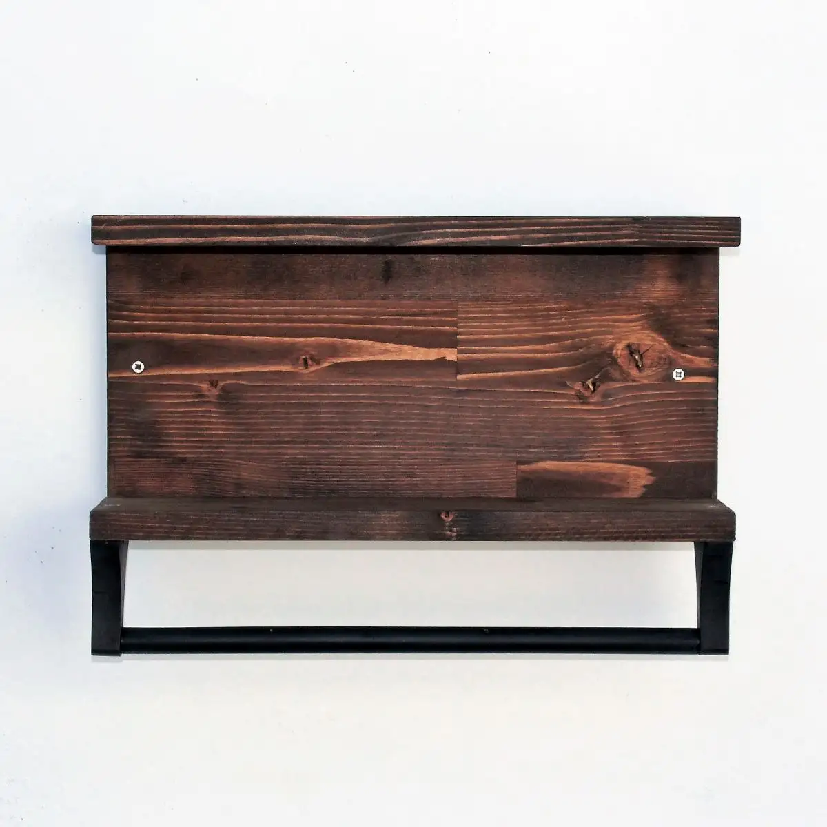 Raft de perete cu 2 polite cu suport pentru prosop sau servet.Realizat din lemn vopsit maro mat, acest raft -suport iti poate fi de folos in bucatarie sau in bale intr-o amenajare rustica, vintage, shabby chic sau stil industrial.