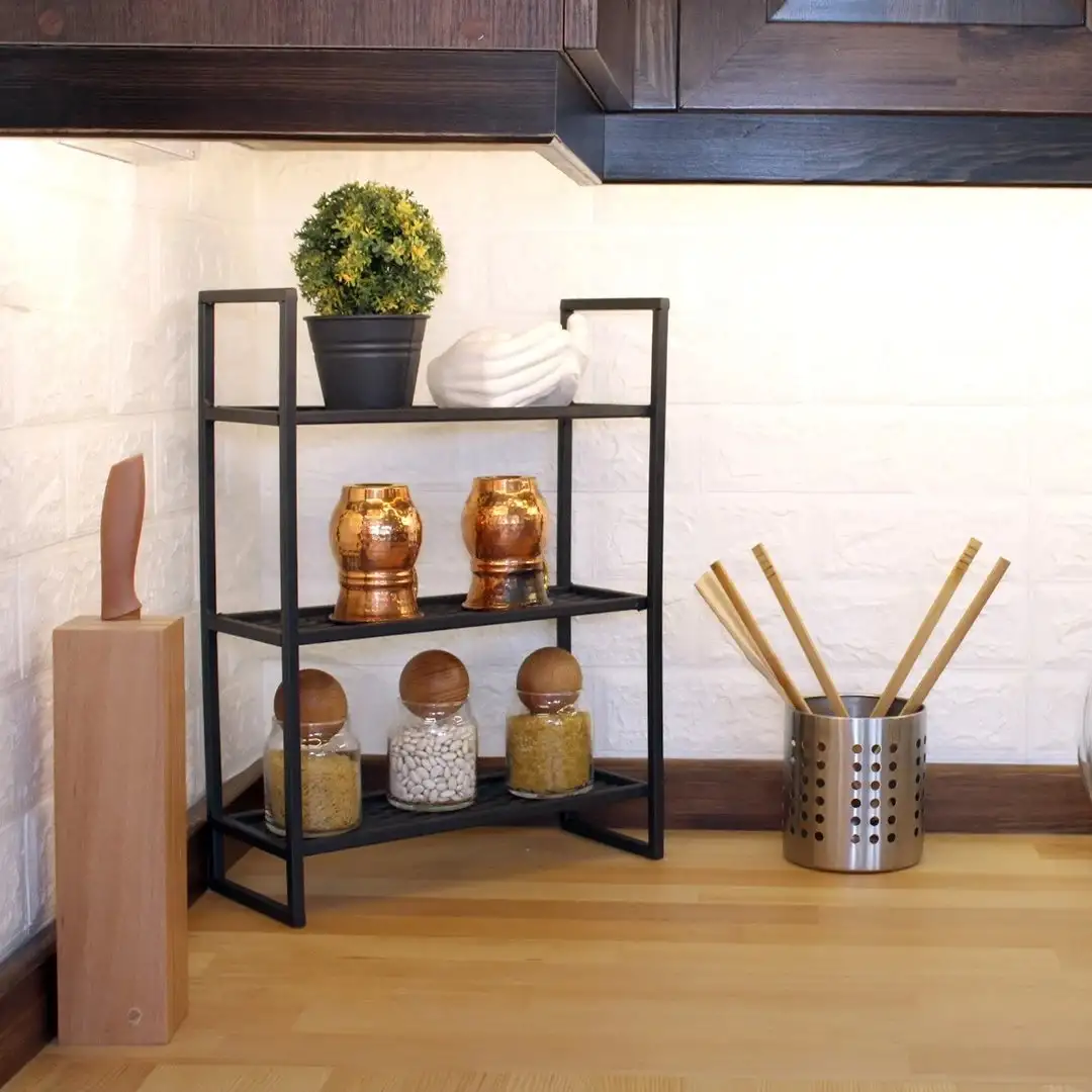 Etajera cu 3 rafturi din metal pentru pahare si cani este solutia ideala pentru organizarea si afisarea eleganta a colectiei tale de vesela in bucatarie. Complateaza mobile bucatarie cu aceasta etajera compacta, dar practica, ce ofera un spatiu de depozitare suplimentar pentru pahare si cani ce iti va facilita accesul la vasele de care ai neboie.