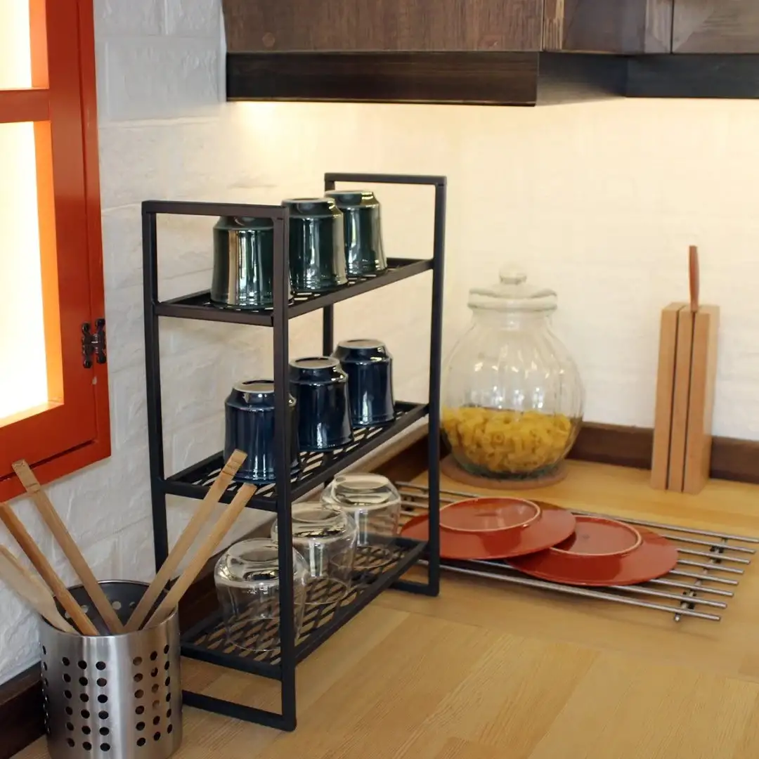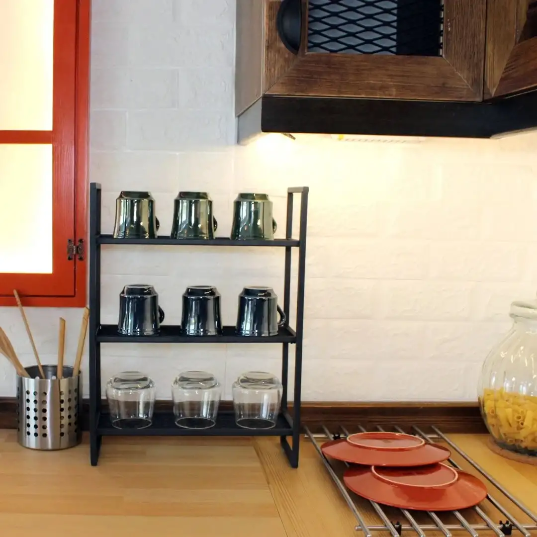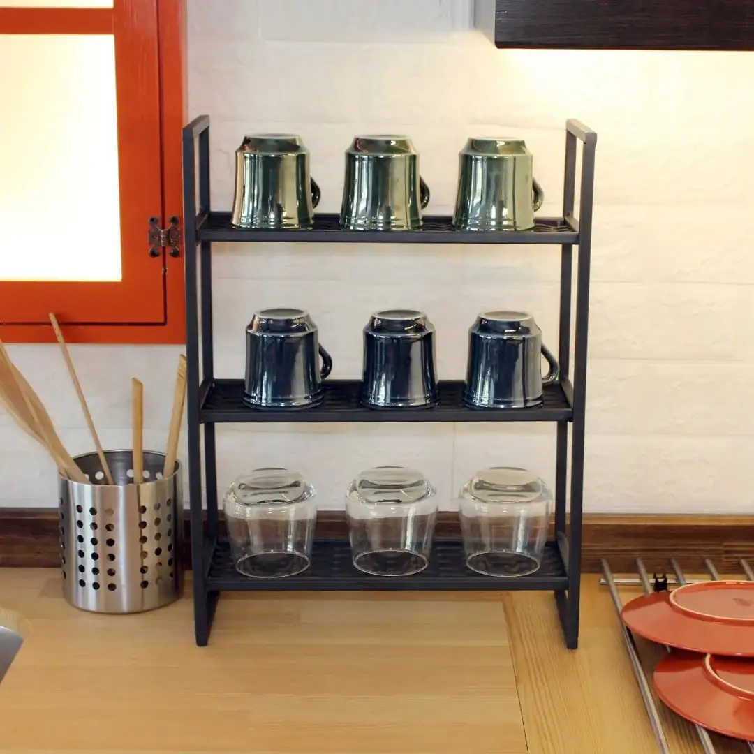 Realizata din metal durabil, aceasta etajera este construita pentru a rezista in timp si pentru a sustine in siguranta vesela. Cele 3 rafturi ofera suficient spatiu pentru a aseza o varietate de pahare si cani, iar designul deschis permite o ventilatie adecvata, prevenind acumularea de umiditate sau mirosuri neplacute.