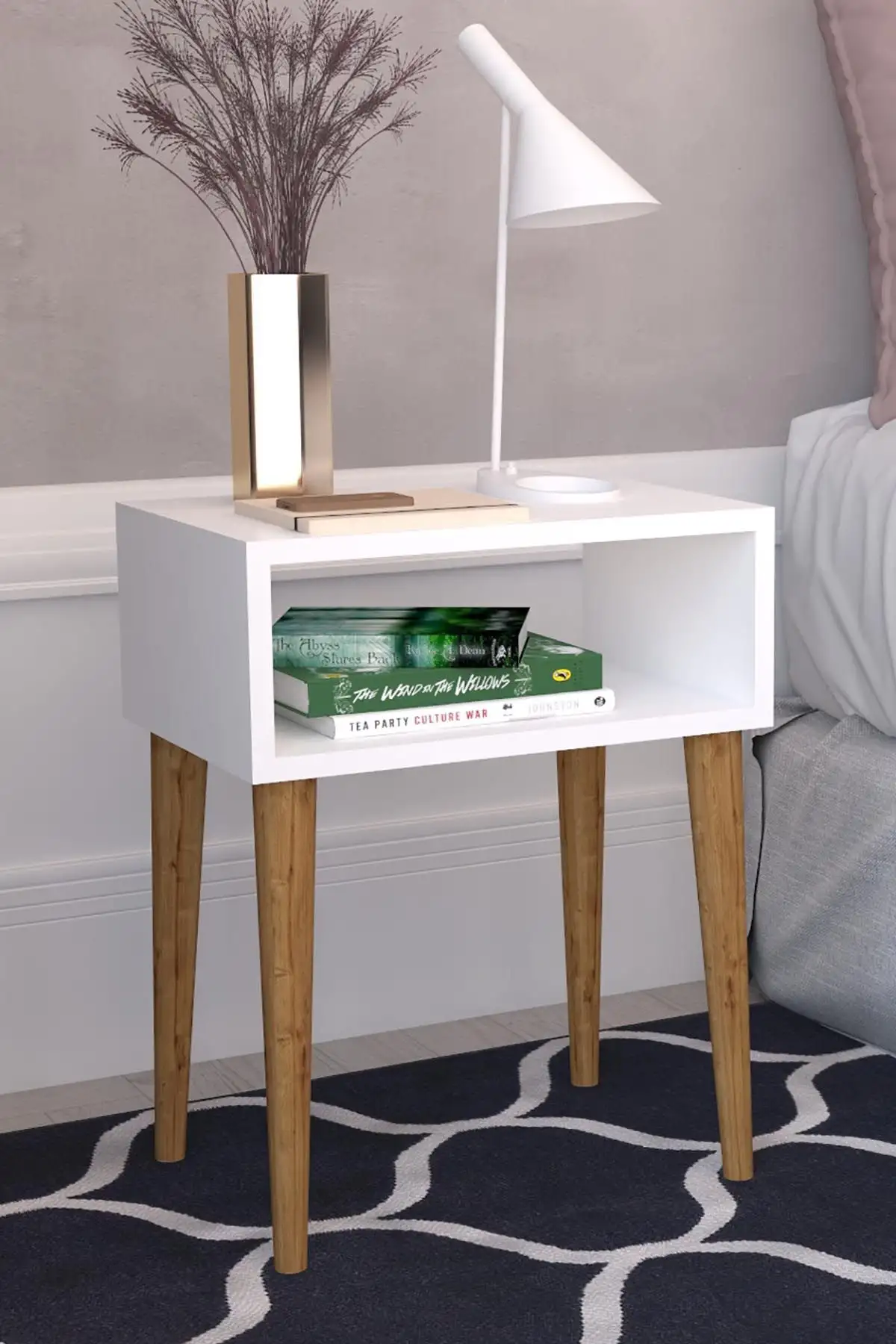 Noptiera deschisa pentru dormitor economica cu design modern. Noptiera are un compartiment deschis pentru depozitare, are corpul alb si picioare culoare nuc.Usor de asortat intr-un decor modern, un decor contemporan.