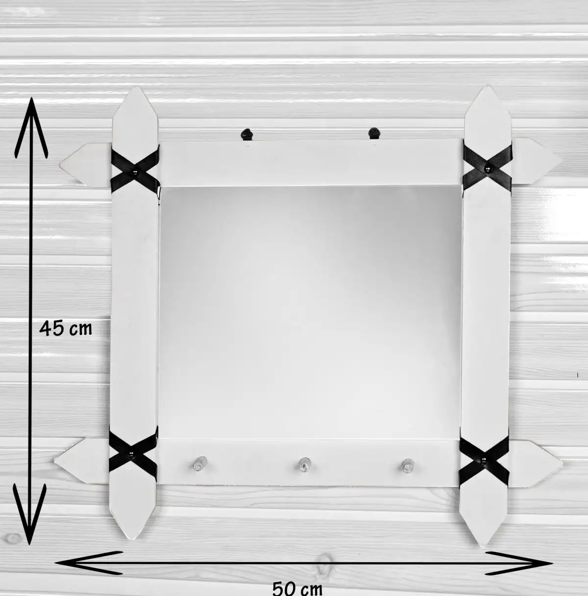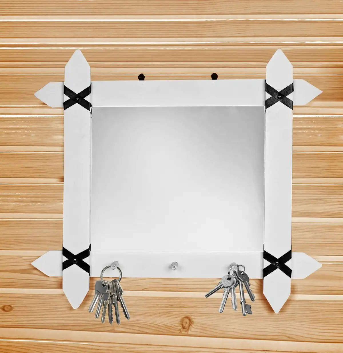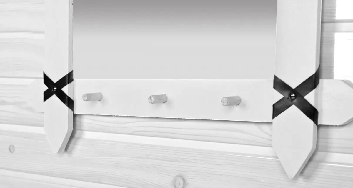 Oglinda pentru hol sau camera cu 3 agatatori pentru chei. Rama este realizata din nlemn stratificat alb, iar pe colturi are legaturi din piele ecologica. Un articol simplu, de efect ce este folositor .