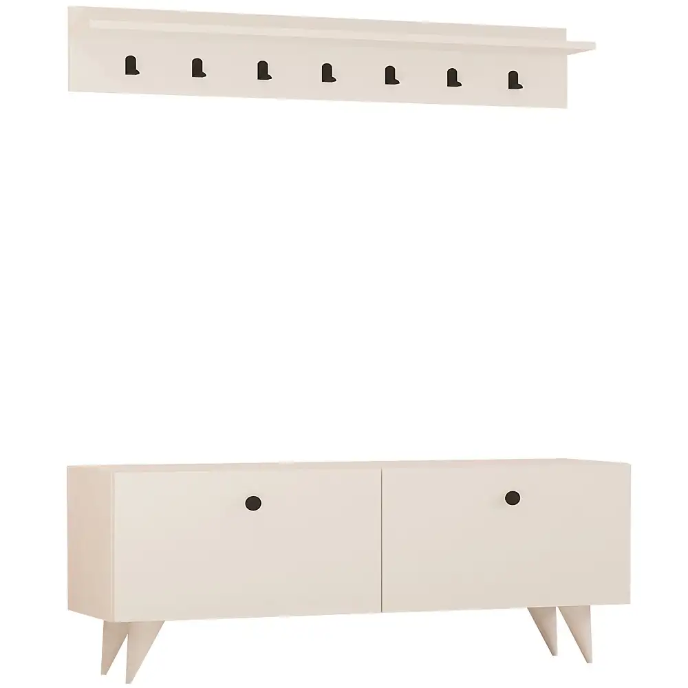 100% MELAMINE COATED PARTICLE BOARDThickness: 18 mmHall Stand Size: Width: 113 cm Height: 48,5 cm Depth: 35 cmWall Shelf Size: Width: 113 cm Height: 20 cm Depth: 15,8 cmHanging Rack Width: 113 cmMultipurpose Hanging RackNumerous ShelvesCan be Fixed to the WallAdditional Storage