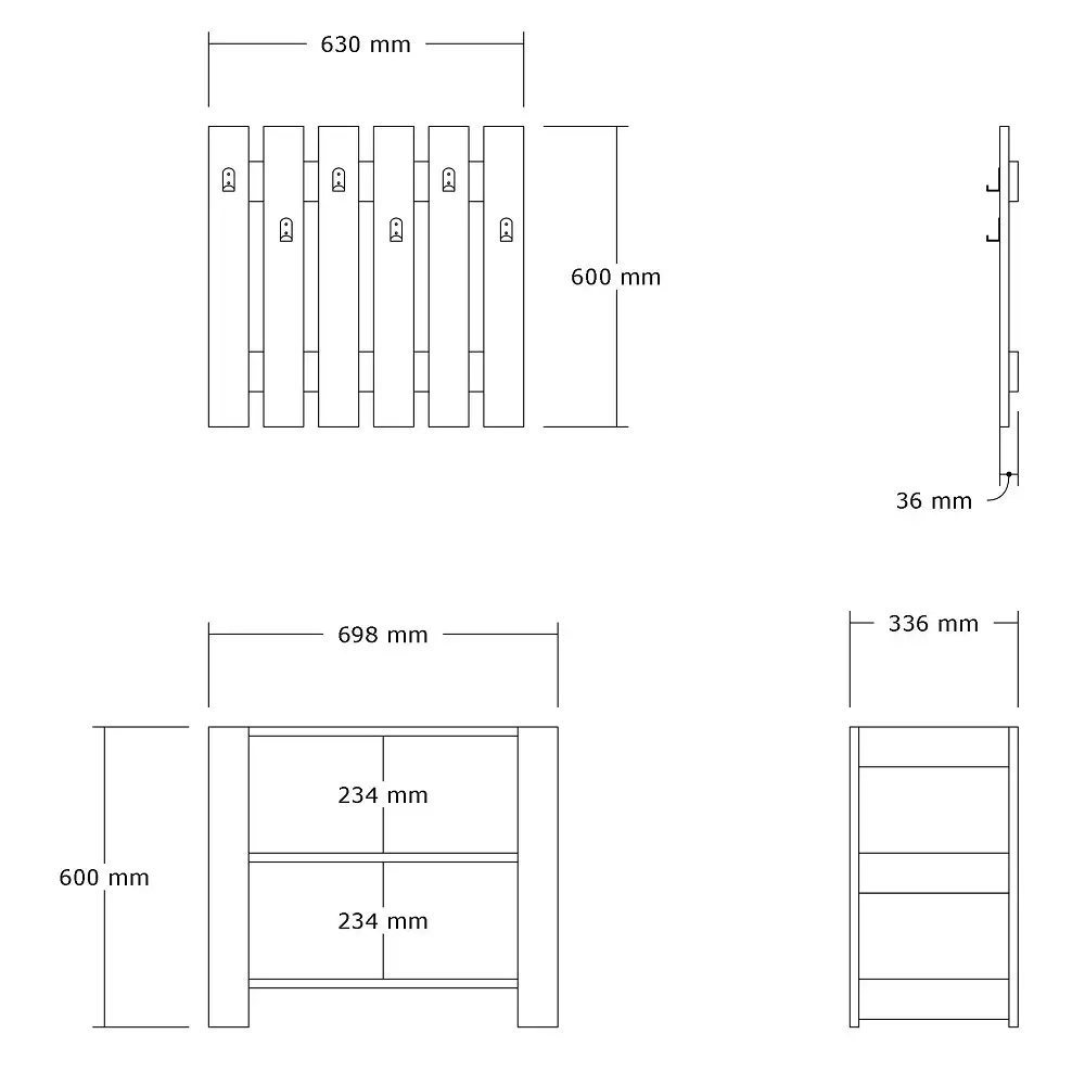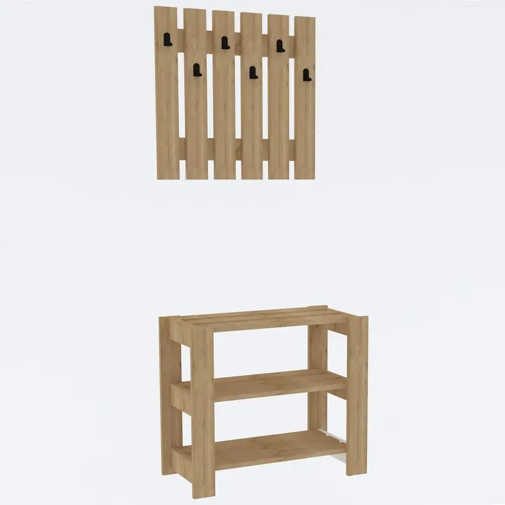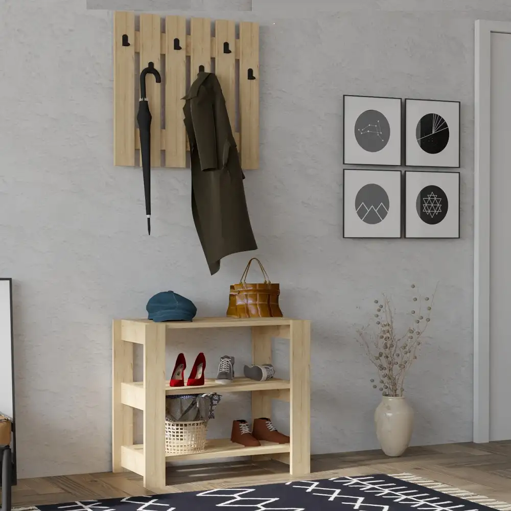 100% MELAMINE COATED PARTICLE BOARDThickness: 18 mmShoe Cabinet Size: Width: 69,8 cm Height: 60 cm Depth: 33,6 cmHanger Size: Width: 63 cm Height: 60 cm Depth: 3,6 cm
