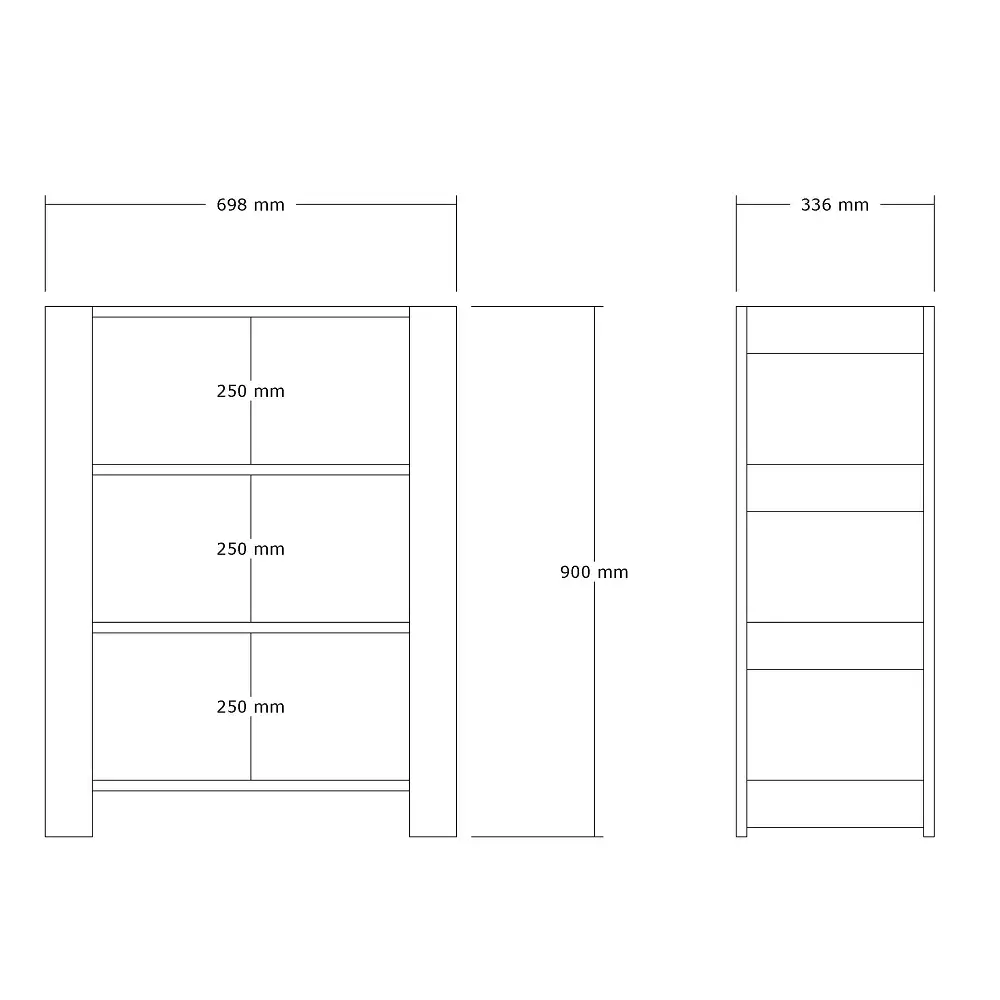 100% MELAMINE COATED PARTICLE BOARDThickness: 18 mmWidth: 69,8 cm Height: 90 cm Depth: 33,6 cm
