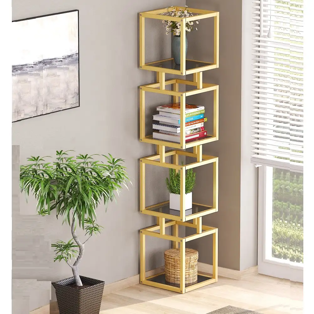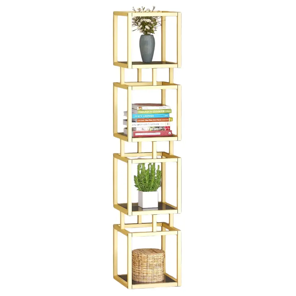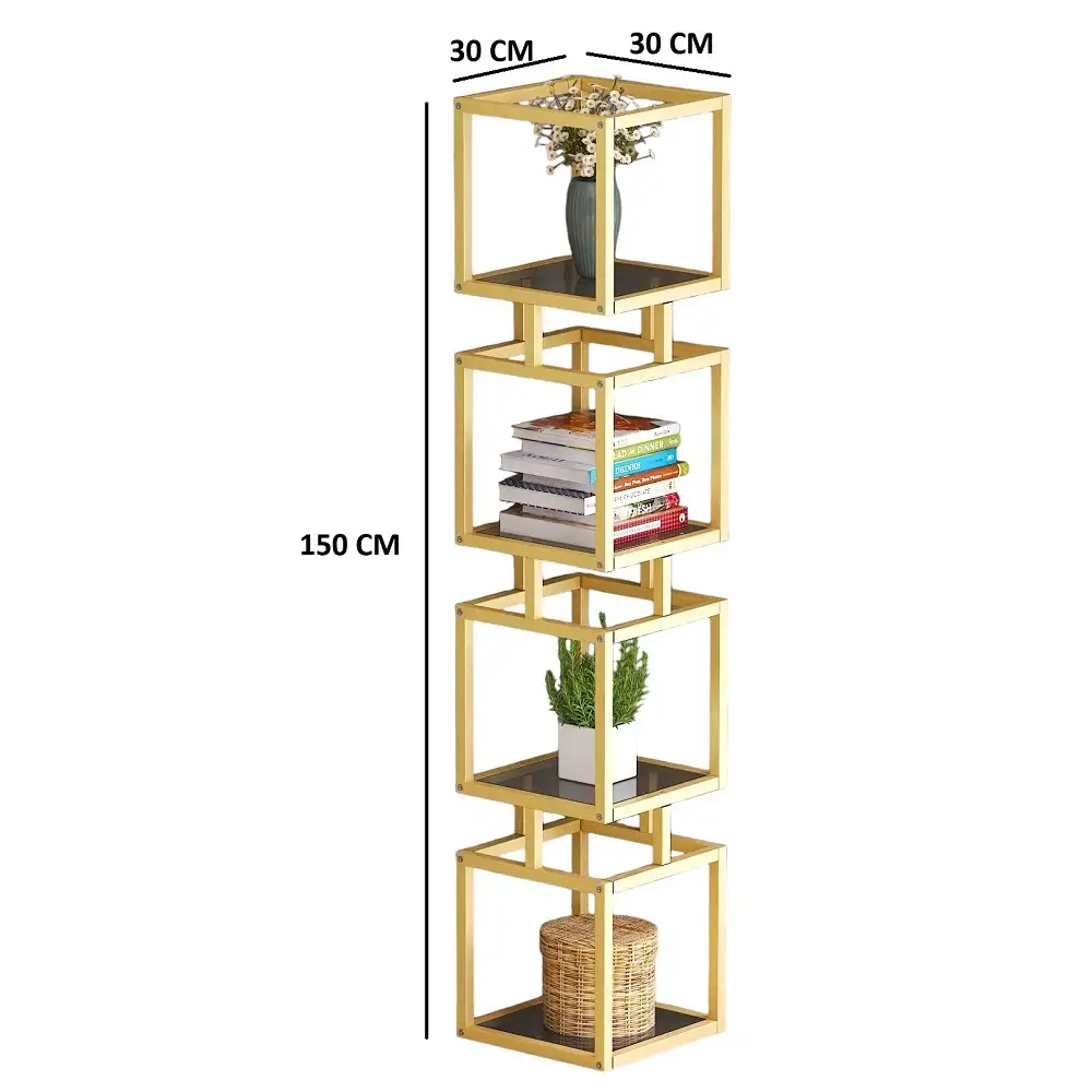 Bibliotecă aurie cu 4 niveluri, sticlă securizată fumurie și rafturi cu cadru metalic