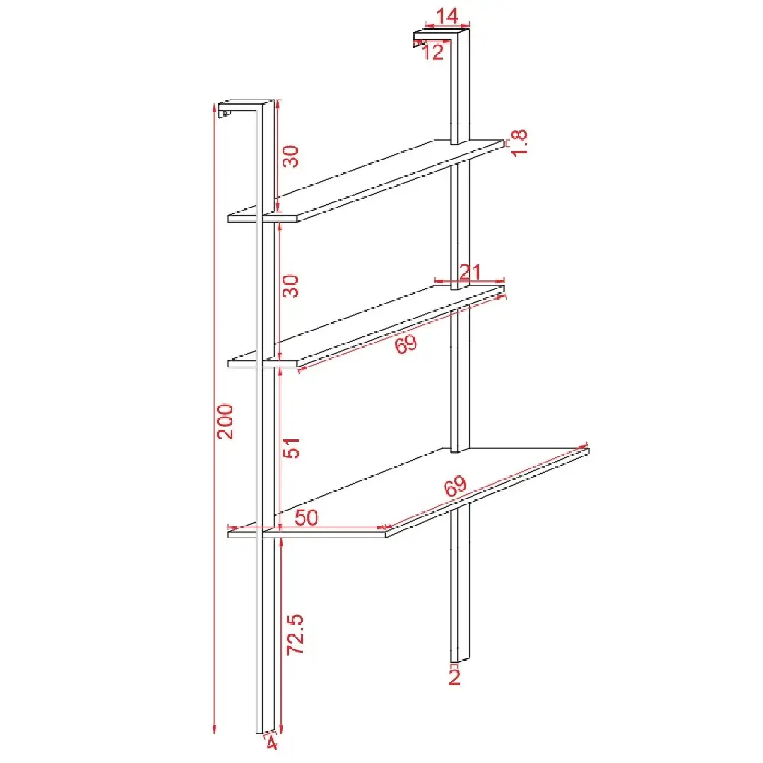 Product sizes: Width: 70 cm Shelf depth: 22 cm Table depth: 50 cm Height: 200cm Shelf thickness: 1.8 cm (-+ 1cm)