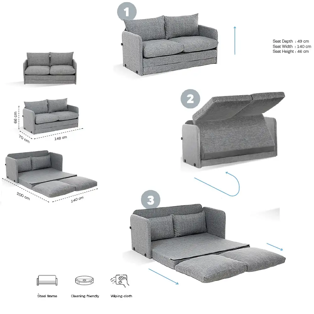 Funcție extensibilă practicăCanapeaua se extinde ușor, ajungând la o suprafață de dormit de 140 x 200 cm – suficient de mare pentru două persoane. Se extinde la nivelul podelei, creând o zonă de odihnă amplă, stabilă și confortabilă.