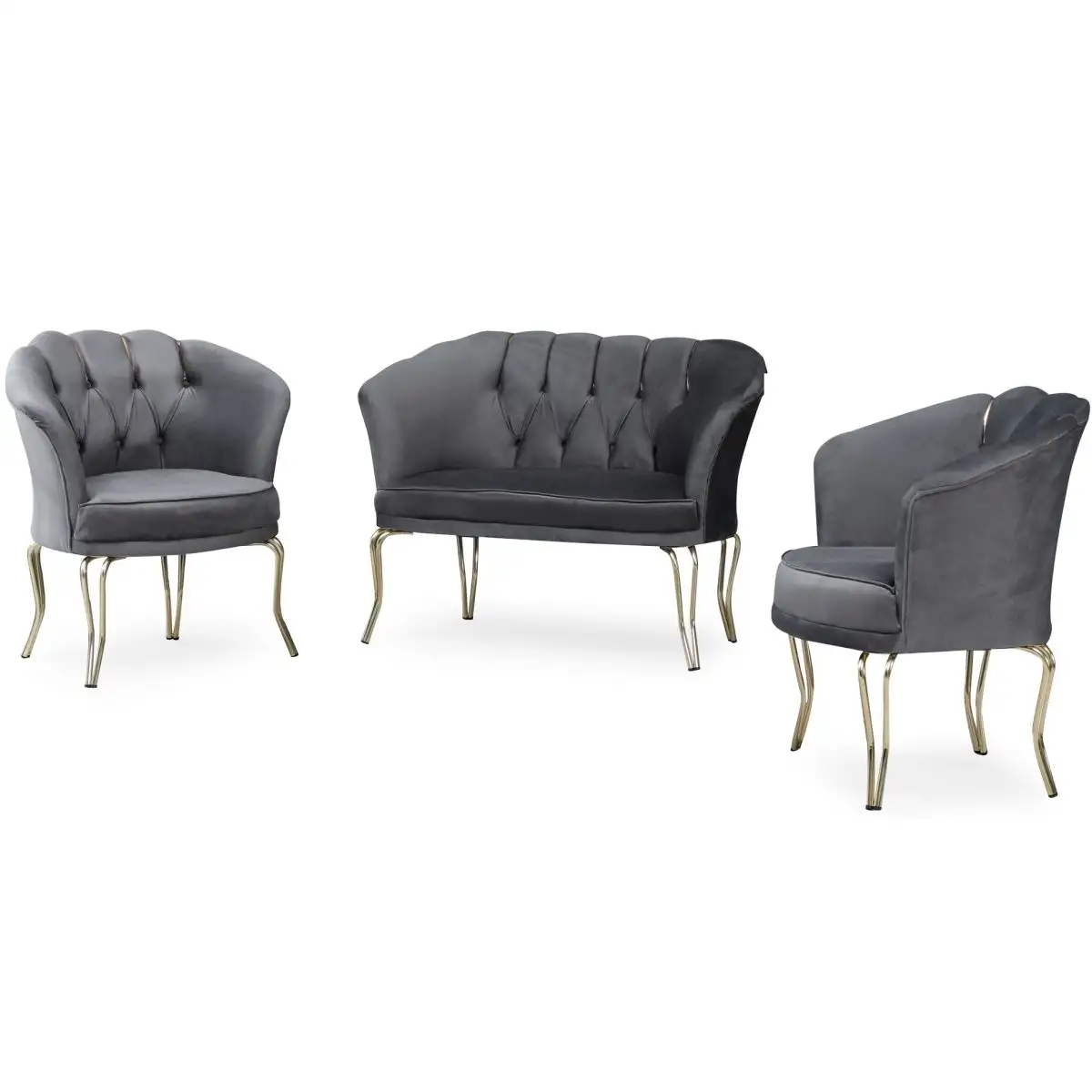 Accente aurii pentru un plus de rafinament – Picioarele metalice suple, finisate în nuanță aurie, adaugă o notă modernă, de lux, fără a încărca vizual piesa. Inserțiile aurii creează contraste discrete și elegante, punând în valoare tapițeria gri.