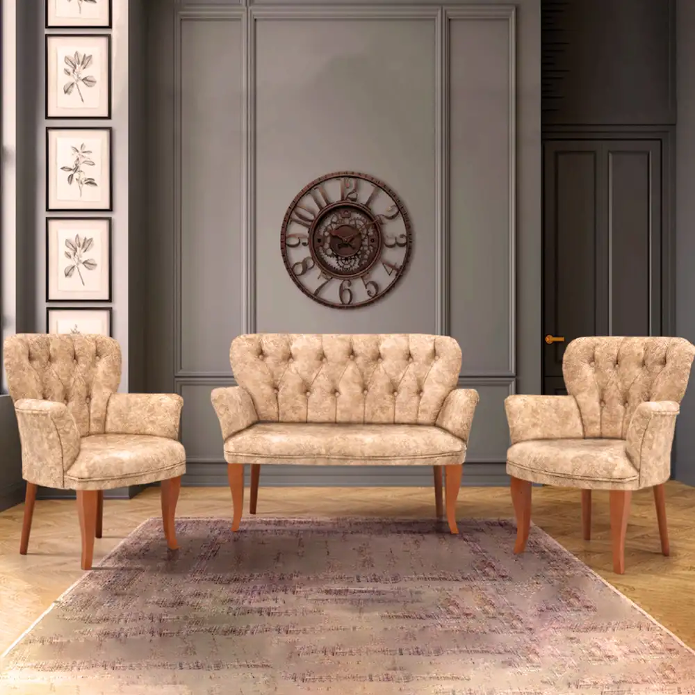 Creeaza un aspect cozy si fermecator in camera de zi, sau in sala de lounge cu Set canapea 2 locuri cu 2 fotolii, Cafe Berta. Setul este unul practic si rafinat, ce combina atat functionalitatea cu eleganta intr-un ansamblu deosebit, pe care-l va indragi toata familia. Canapeaua cu linii clasice pastreaza cadrul boem, care face orice living mai primitor.