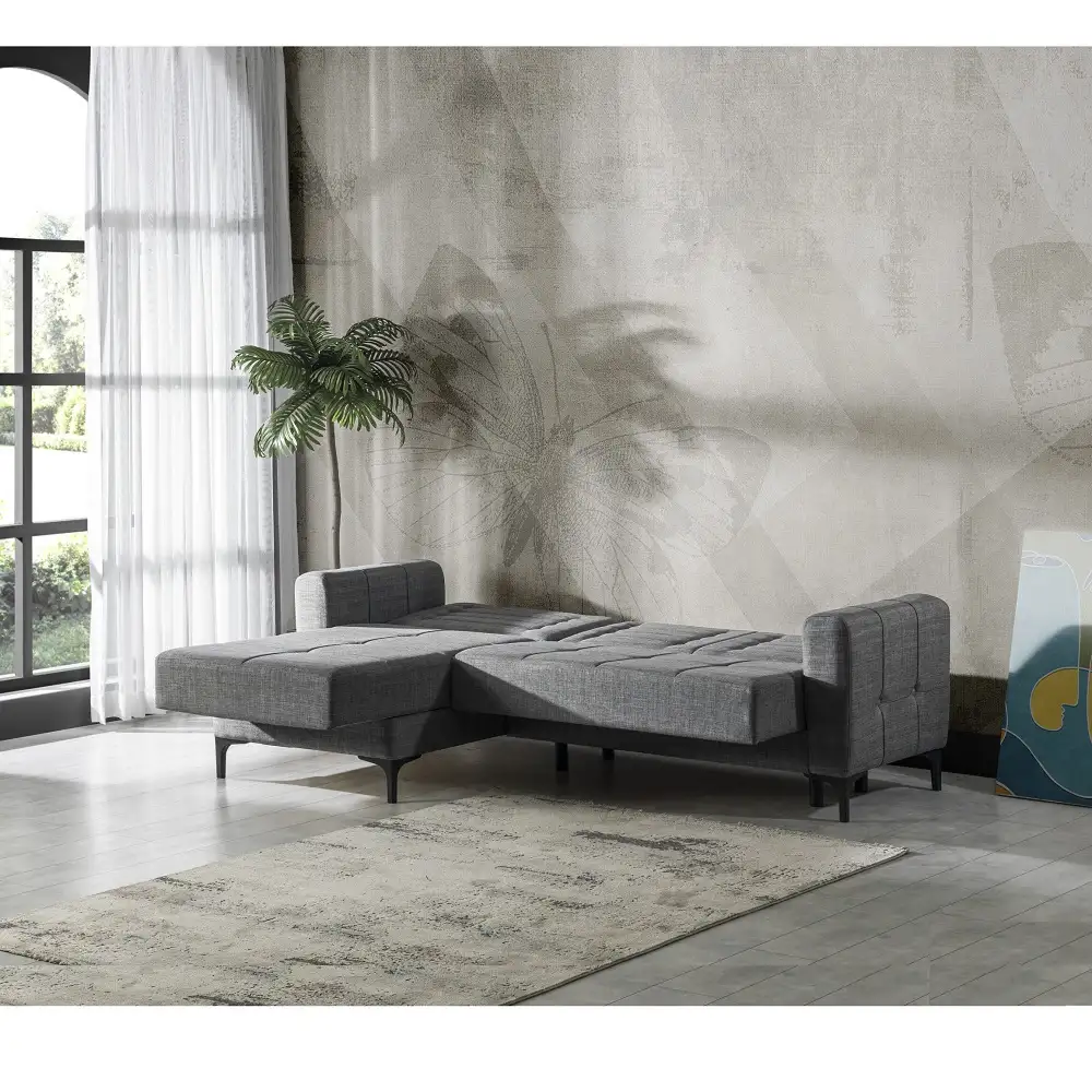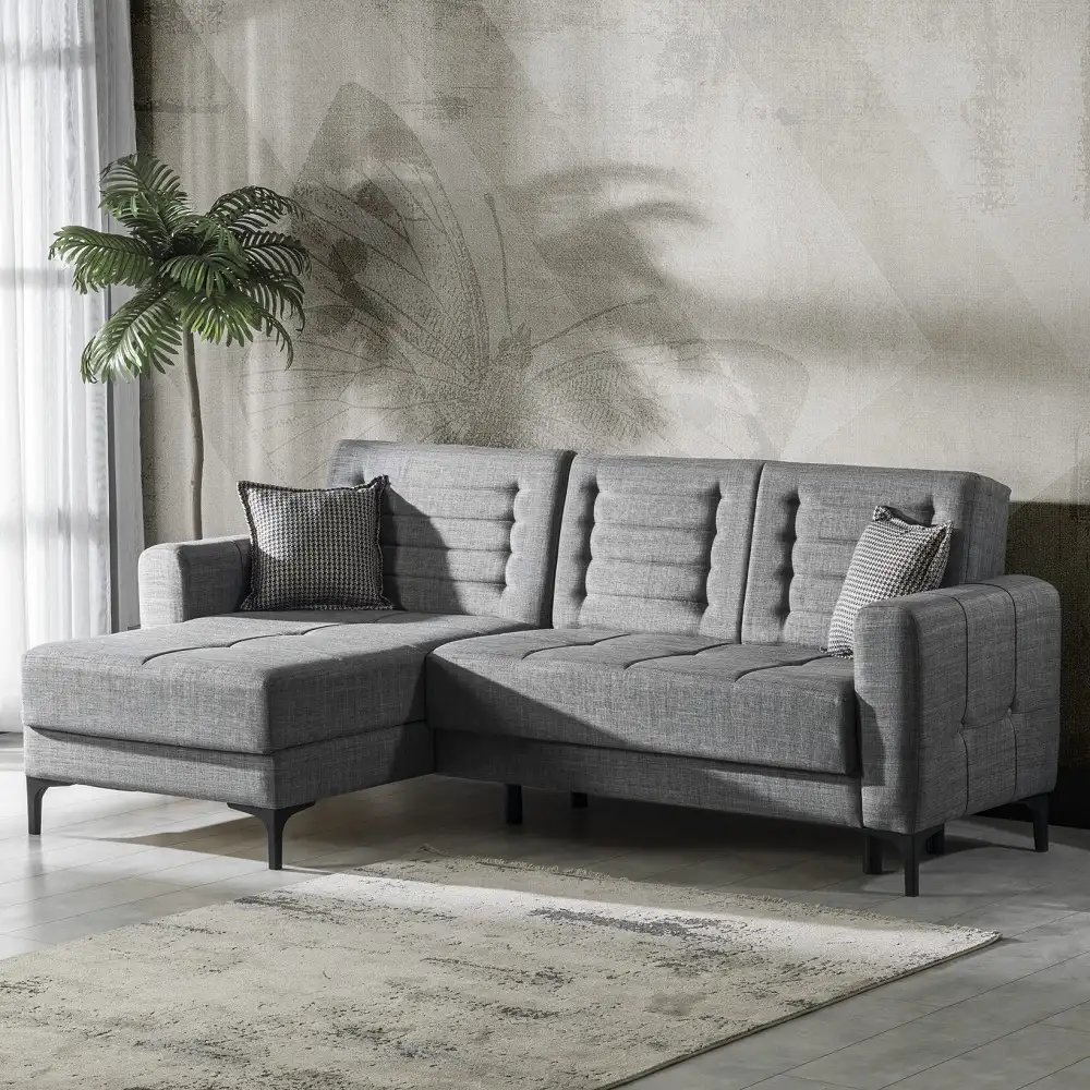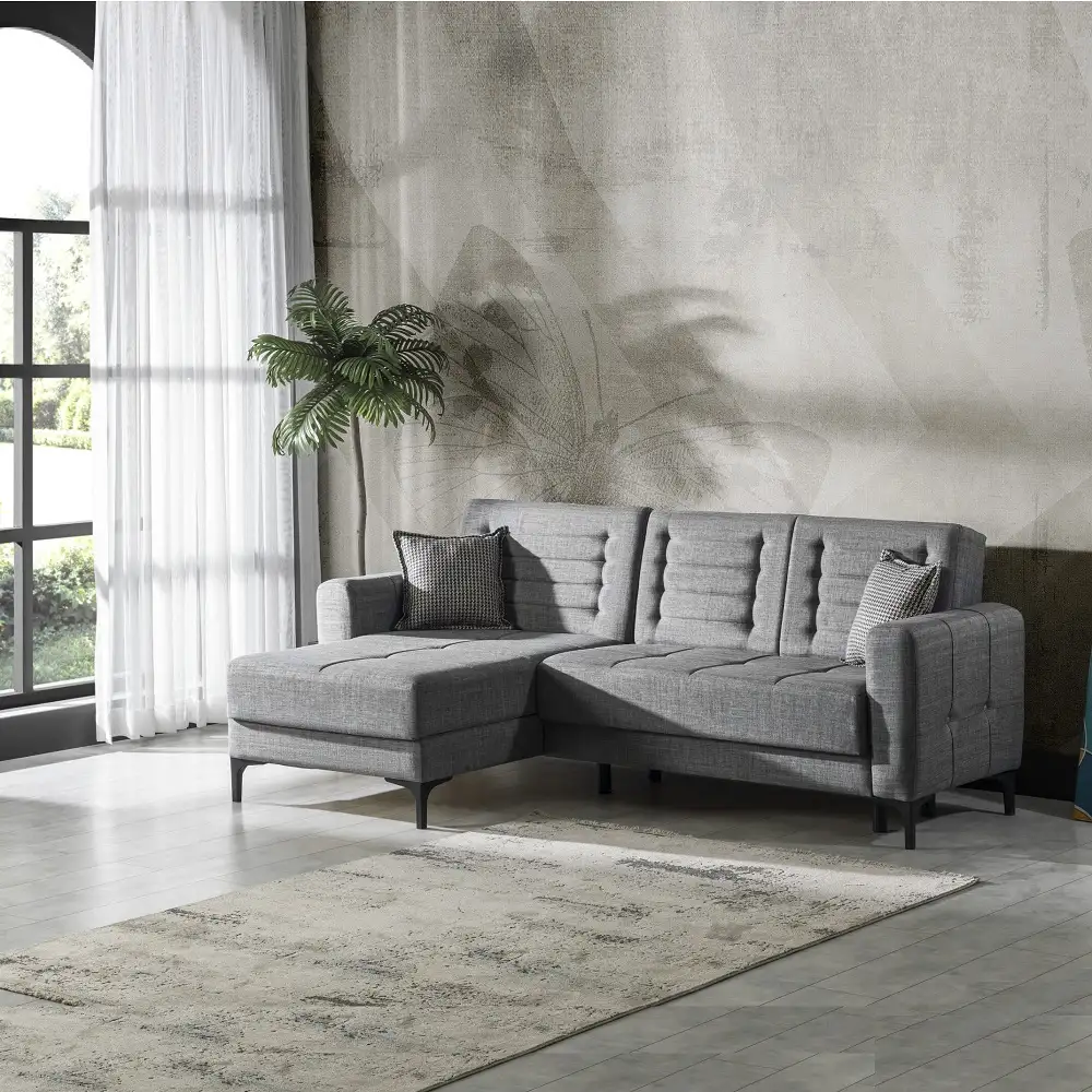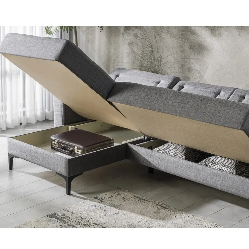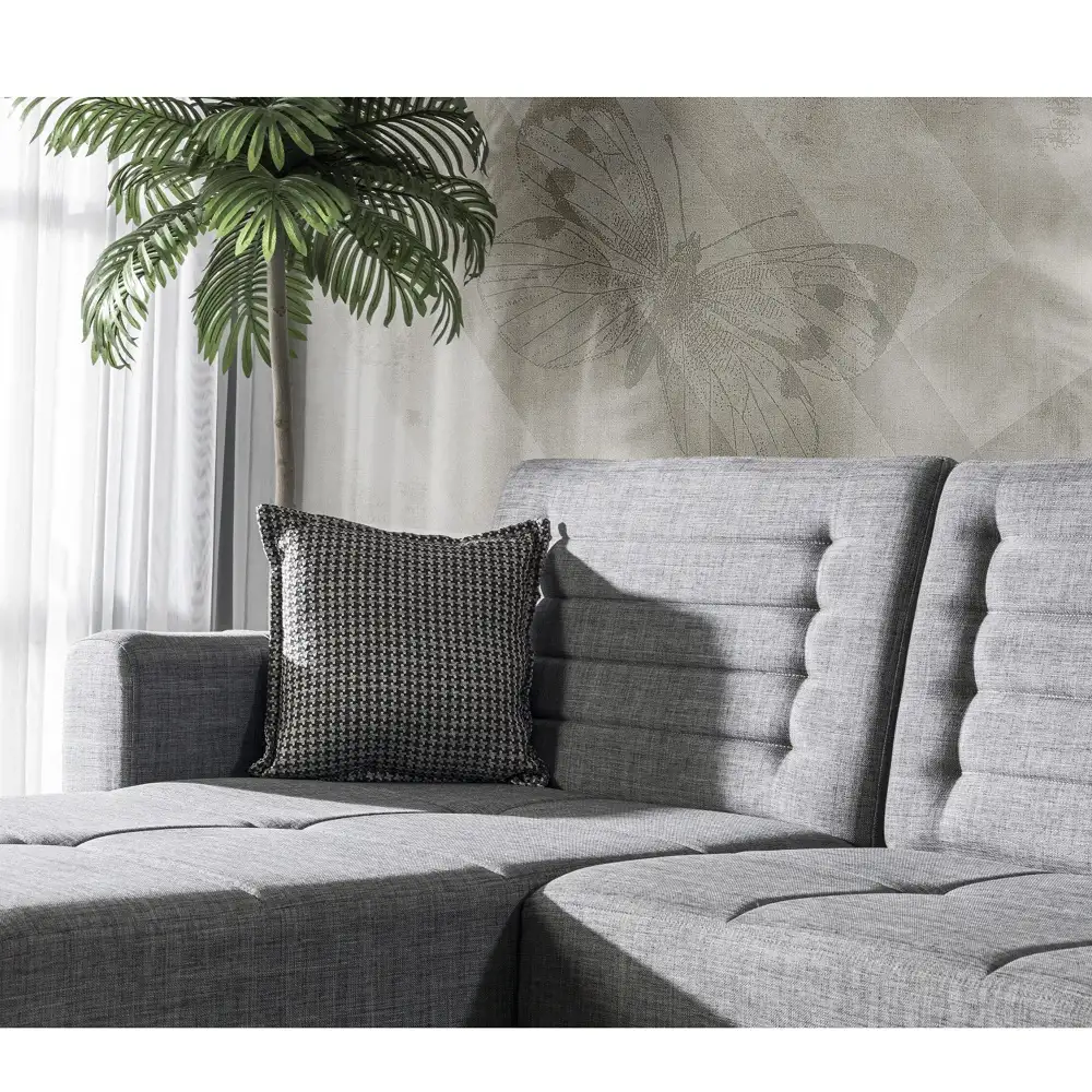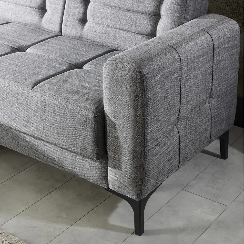 Coltar extensibila Porto este tapitat textil. Salteaua este confectionata din arcuri, fin si placut la atingere.Coltar reversibil.