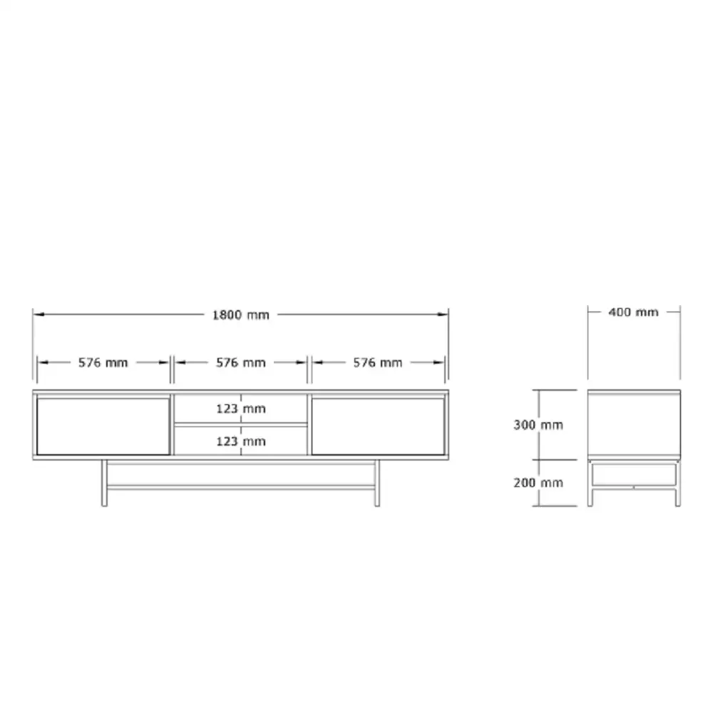 100% MELAMINE COATED PARTICLE BOARDThickness:18 mmWidth: 180 cm Height: 50 cm Depth: 40 cmMiddle Shelf Width: 57,6 cmShelf Height: 12,3 cm