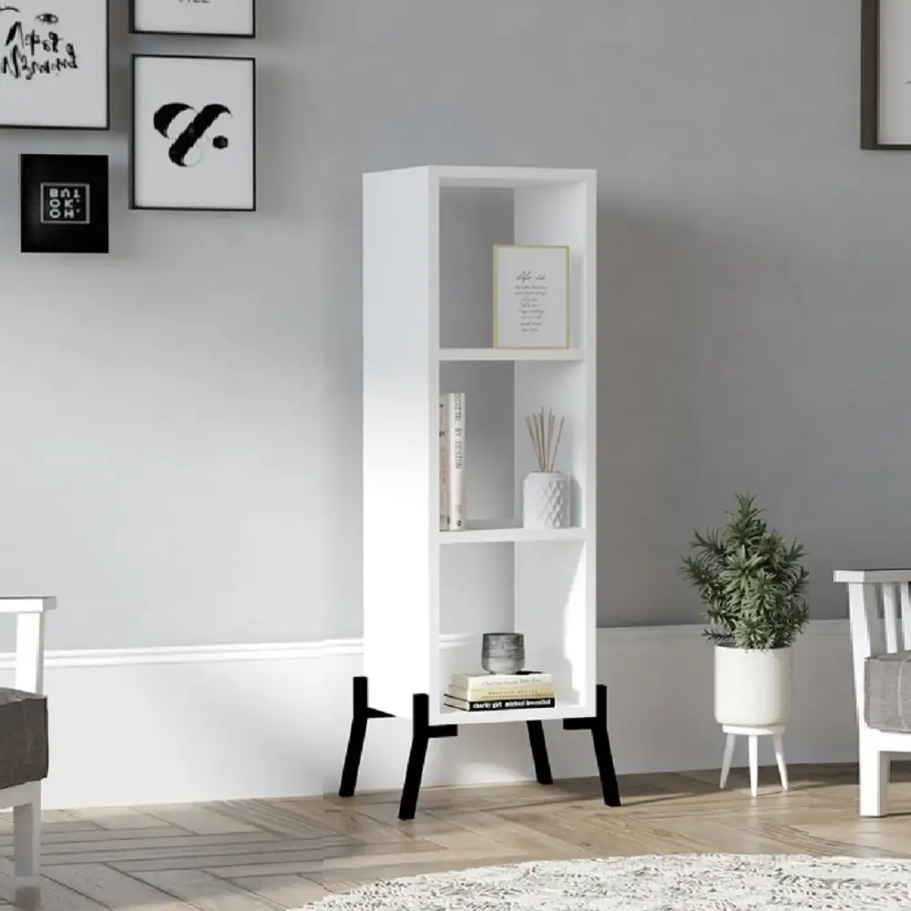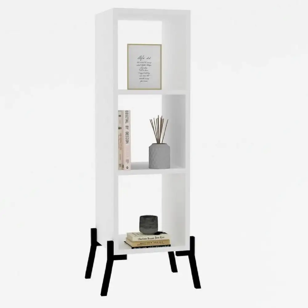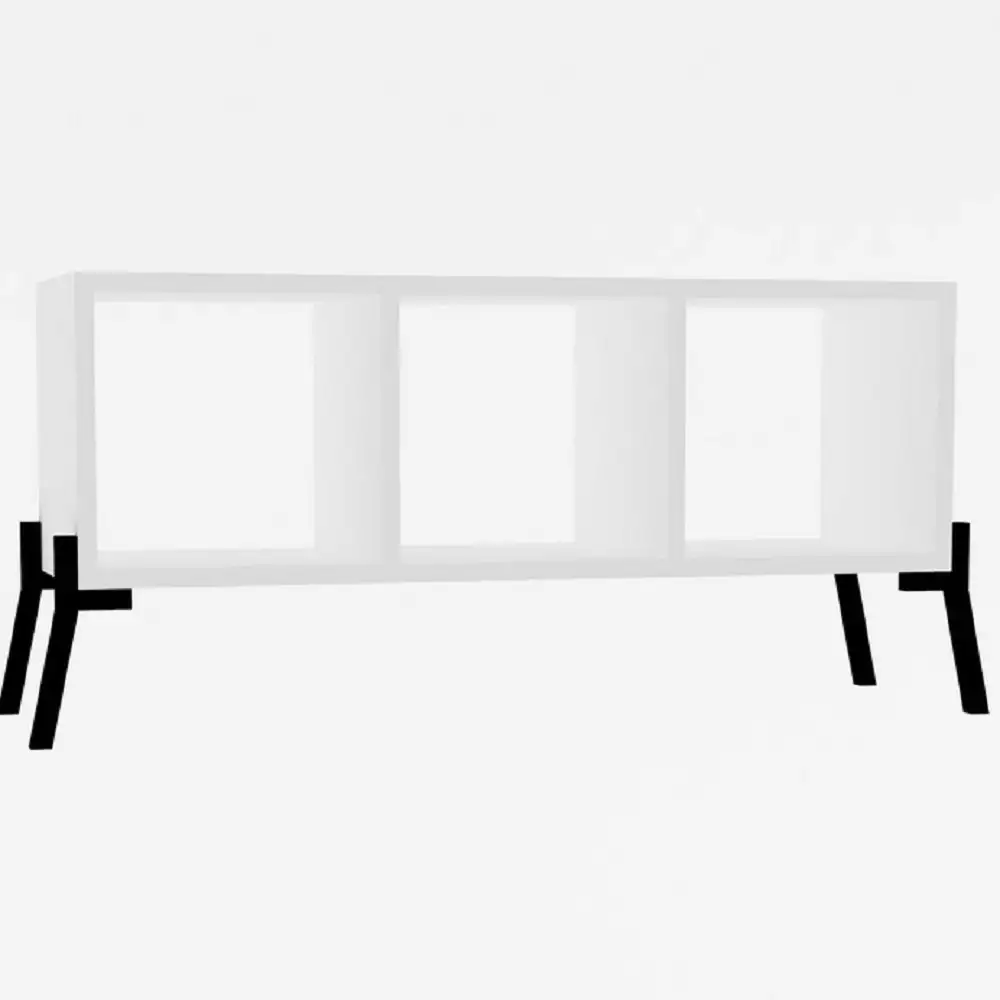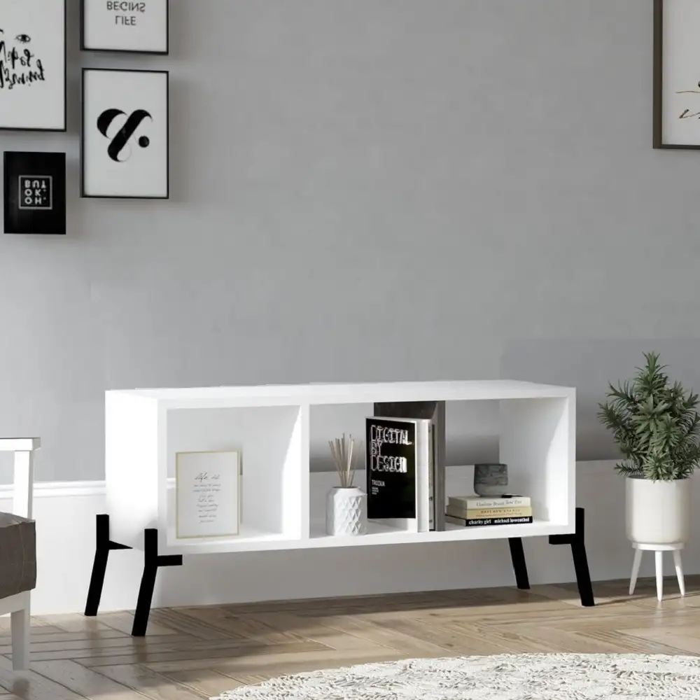 – Design multifuncțional: Poate fi utilizată atât drept comodă TV, cu trei rafturi deschise pentru echipamentele media, cât și ca bibliotecă verticală, ideală pentru depozitarea cărților și a accesoriilor. Înălțimea picioarelor de 13 cm asigură stabilitate și un aspect elegant.
