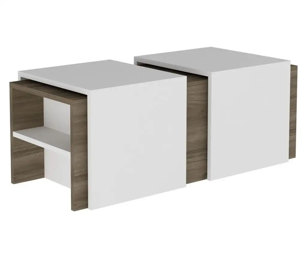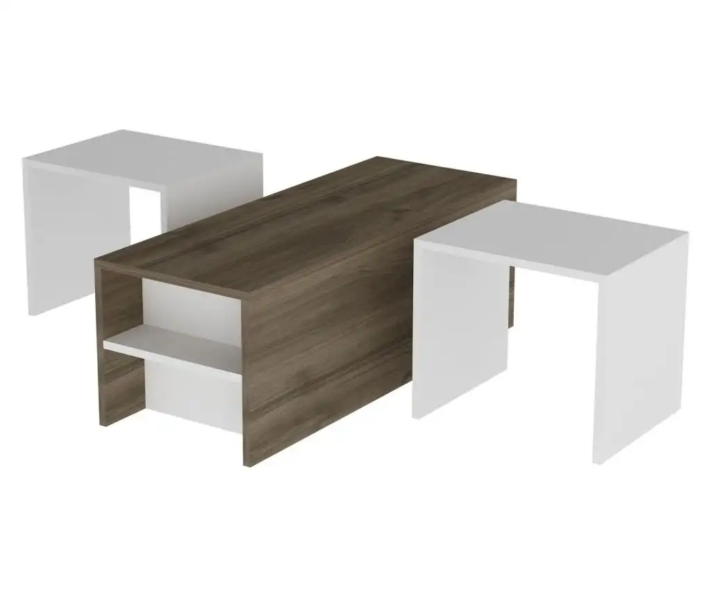Masa de cafea pentru living cu 2 masute detasabile incluse. Masa este functionala pentru ca se foloseste zilnic cu masutele atasate, iar cand este necesar se ridica si se pot aseza langa musafiri. Design modern ,combinatie de culori placuta, alb cu nuc.
