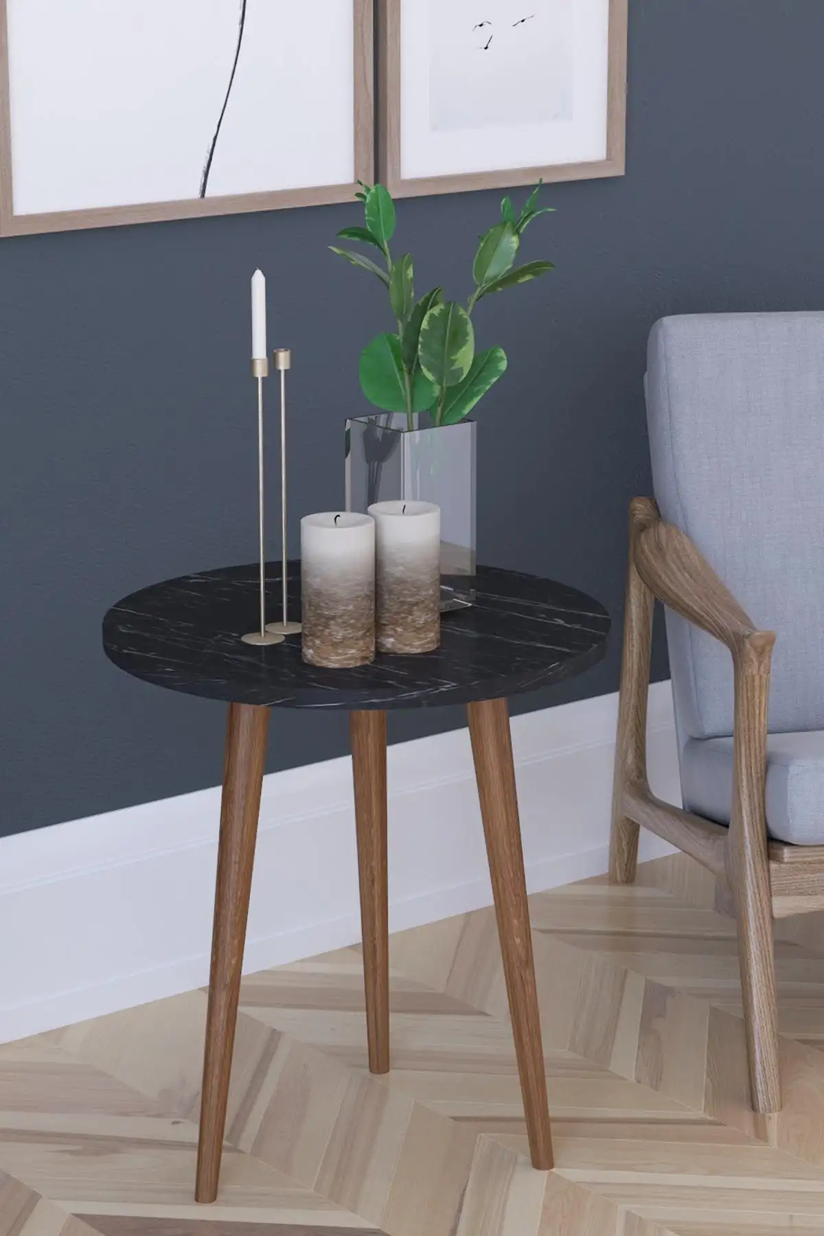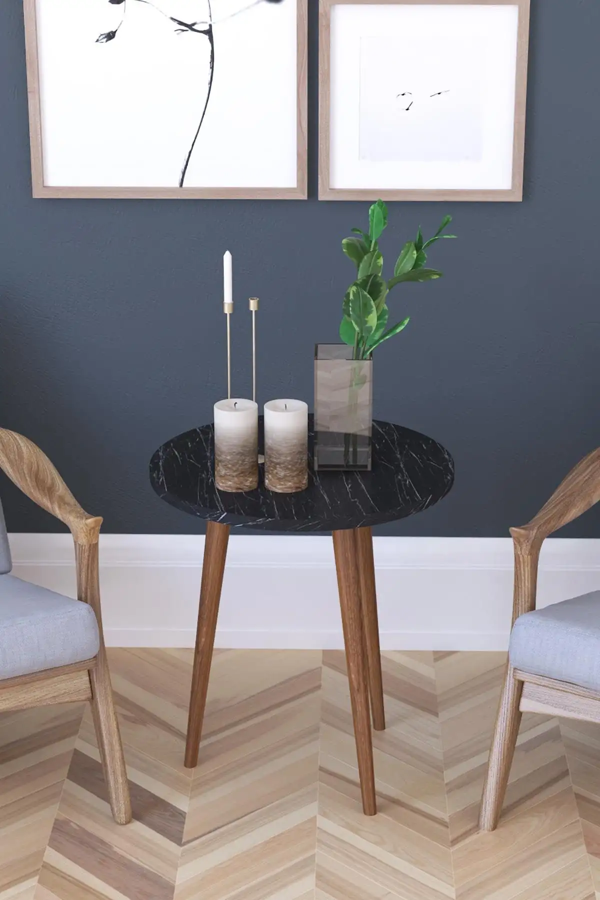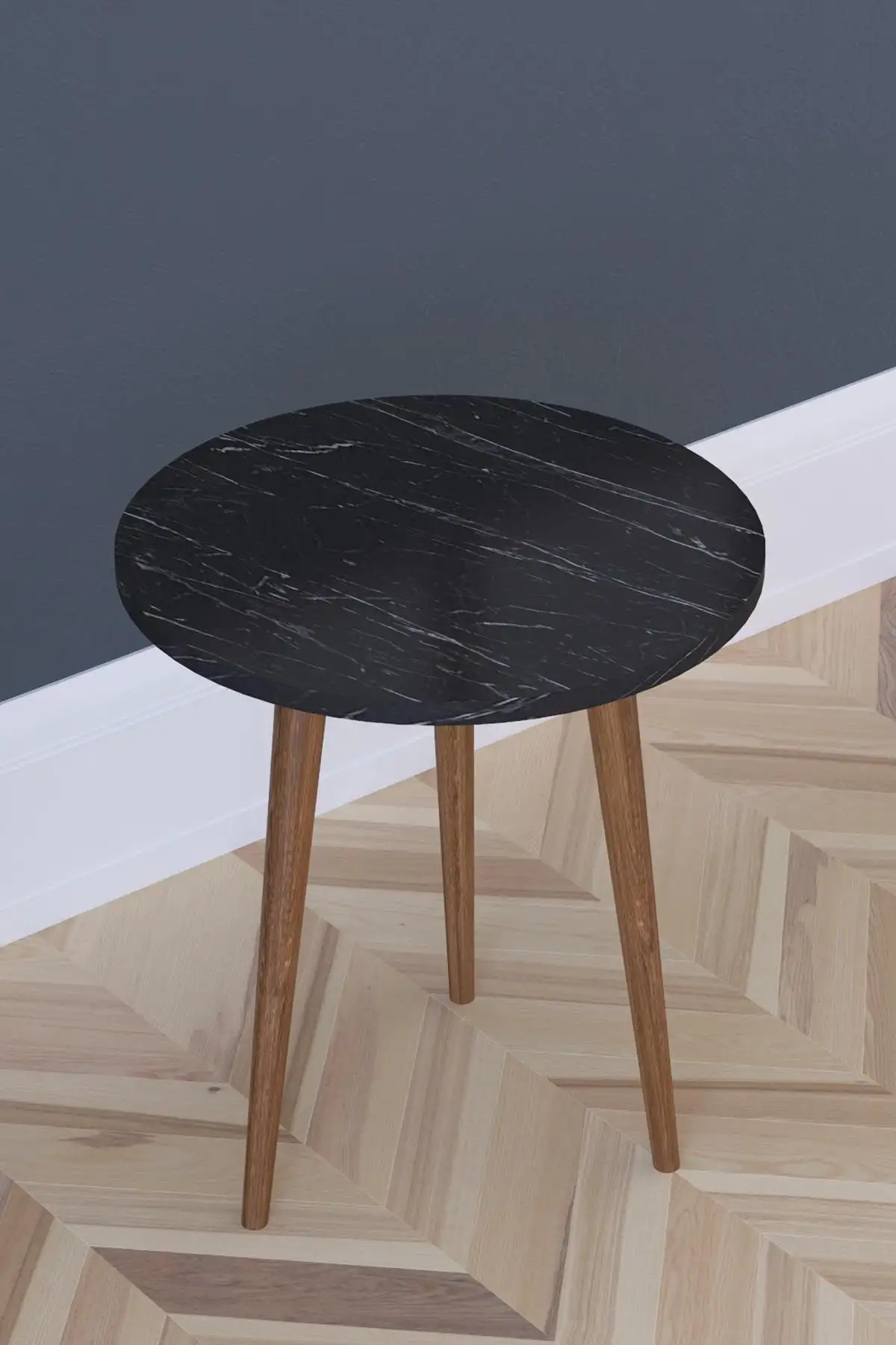 Masa de cafea de dimensiuni reduse ,cu design simplu modern. Masuta este potrivita intre 2 fotolii sau ca masuta laterala pentru canapea. Blatul este realizat din pal de 18 mm culoare negru marmorat cu picioare din lemn culoare nuc.