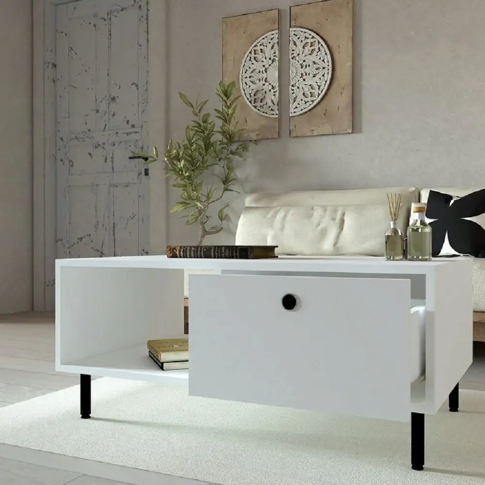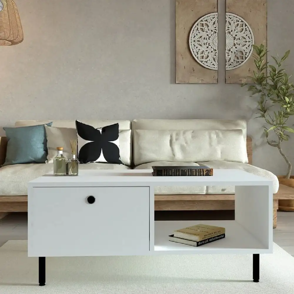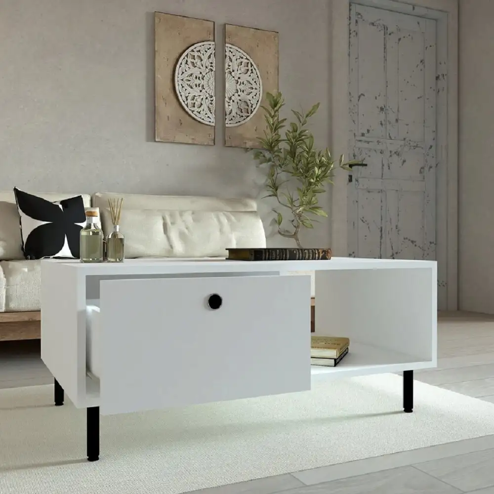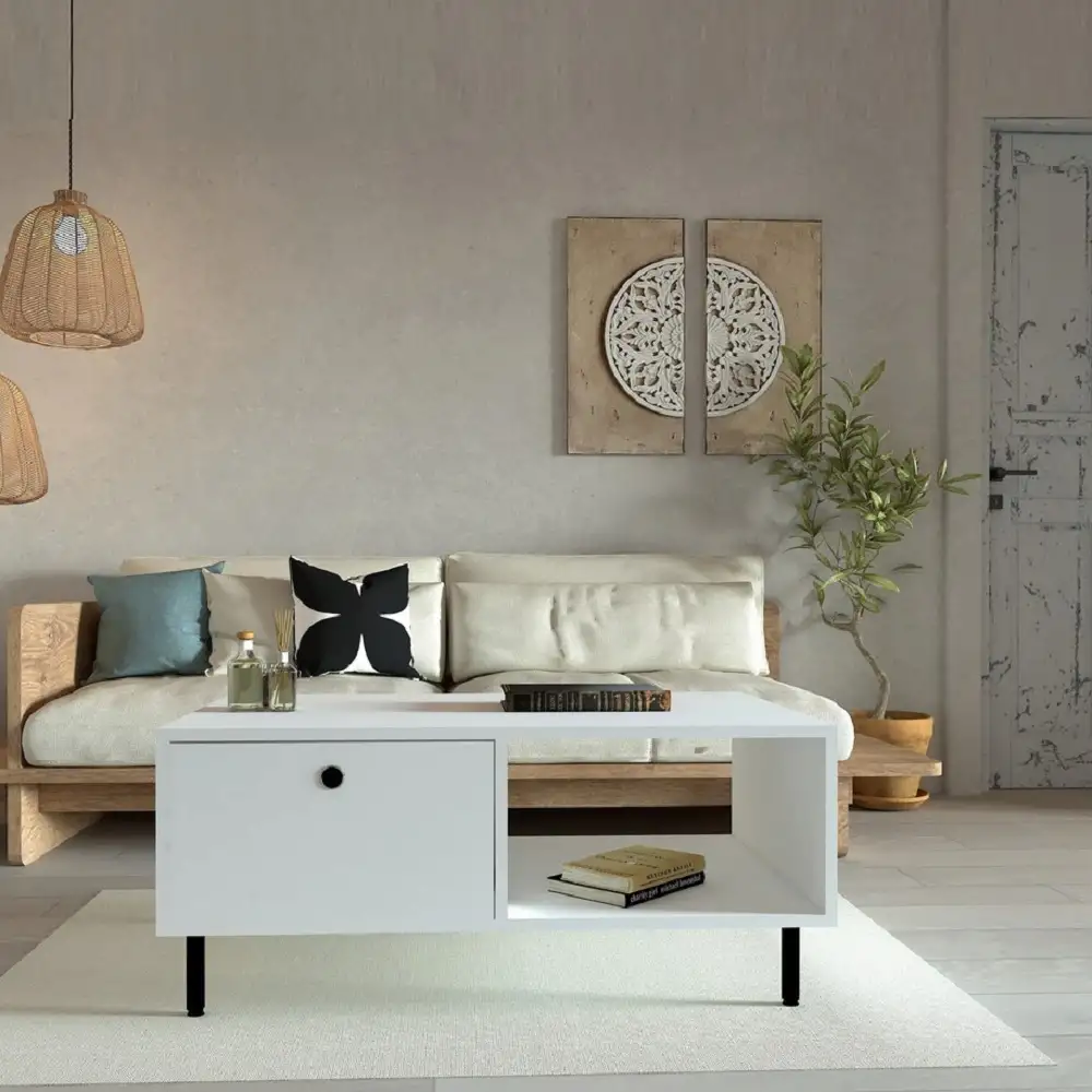 Îți dorești un colț de relaxare care să aducă un strop de eleganță și utilitate în locuința ta? Masa de cafea Nando albă, cu sertar, este soluția ideală pentru a adăuga un plus de strălucire și versatilitate în livingul tău. Cu un design curat și sofisticat, această masă se integrează perfect în orice decor și îmbină estetica și utilitate într-un mod desăvârșit.