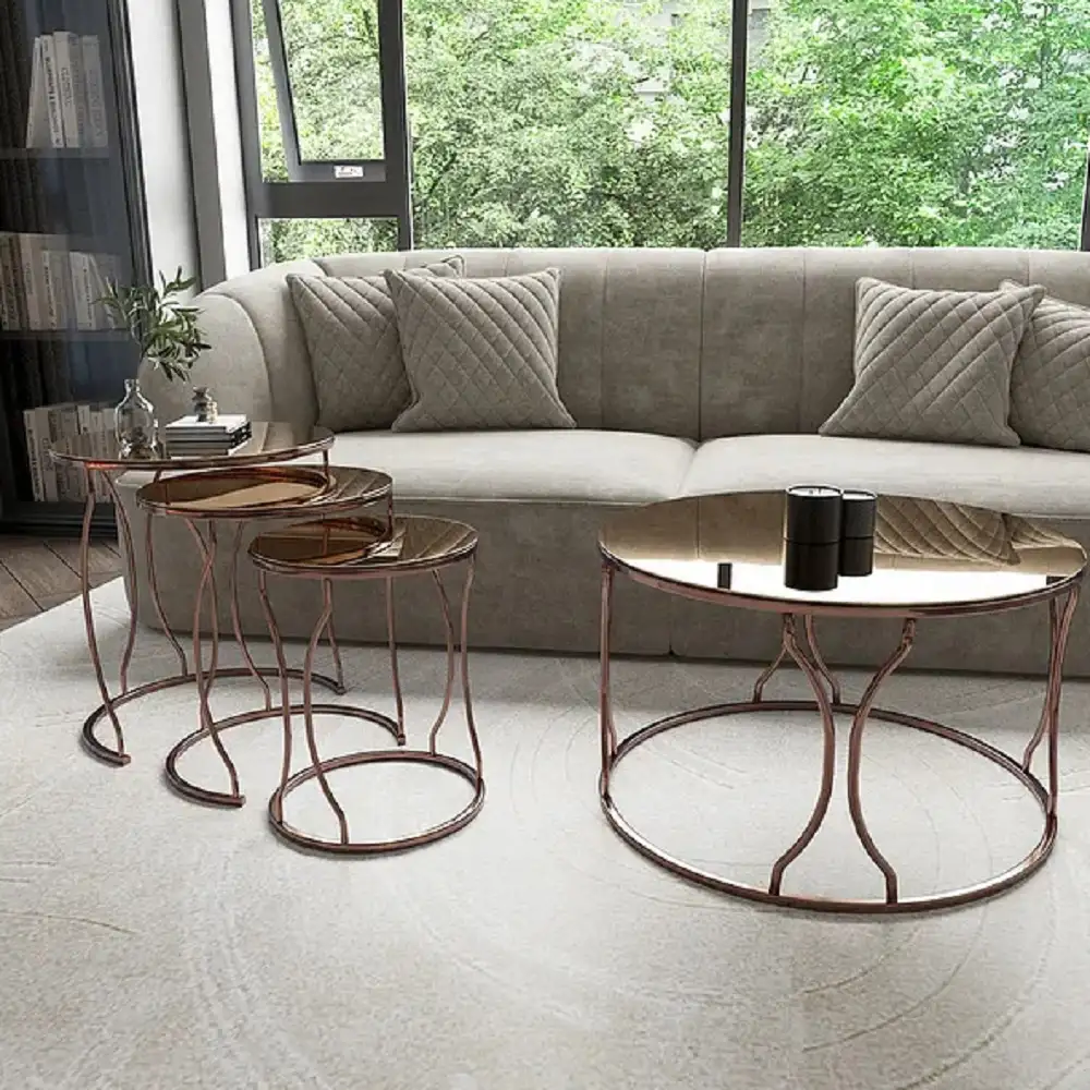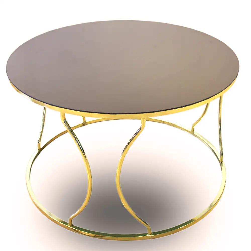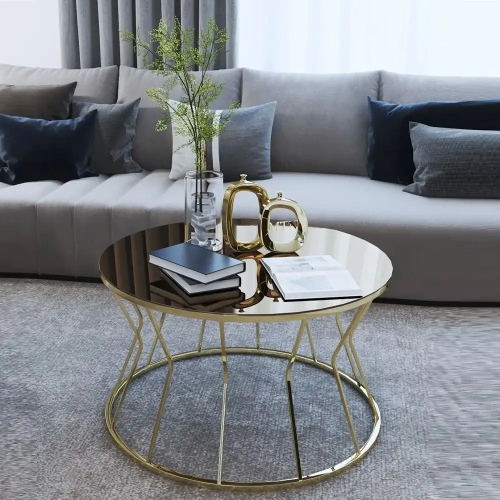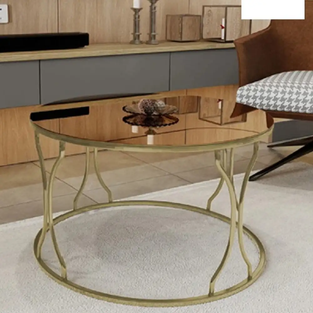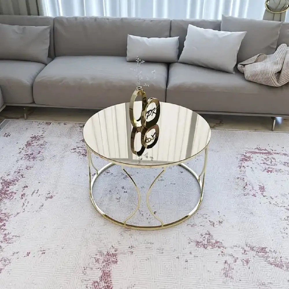 Blatul este realizat din sticlă rezistentă, cu aspect de oglindă, iar cadrul este din metal vopsit în nuanța aurie, oferind stabilitate și rezistență pentru mult timp. Structura suportă uzura zilnică fără a compromite eleganța sau funcționalitatea.