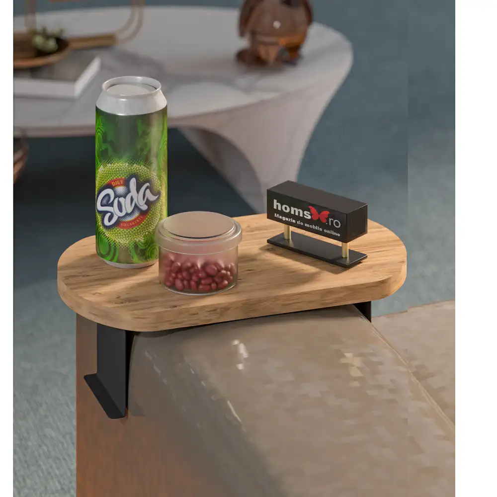 Măsuța de cafea laterală Verla Homs este soluția ideală pentru momentele tale de relaxare. Blatul în nuanță caldă de nuc și structura metalică neagră creează un contrast elegant, integrându-se perfect în orice tip de amenajare. Compactă și ușor de montat, această măsuță se atașează direct de brațul canapelei, oferindu-ți un suport practic pentru cafea, cartea preferată sau telecomandă.