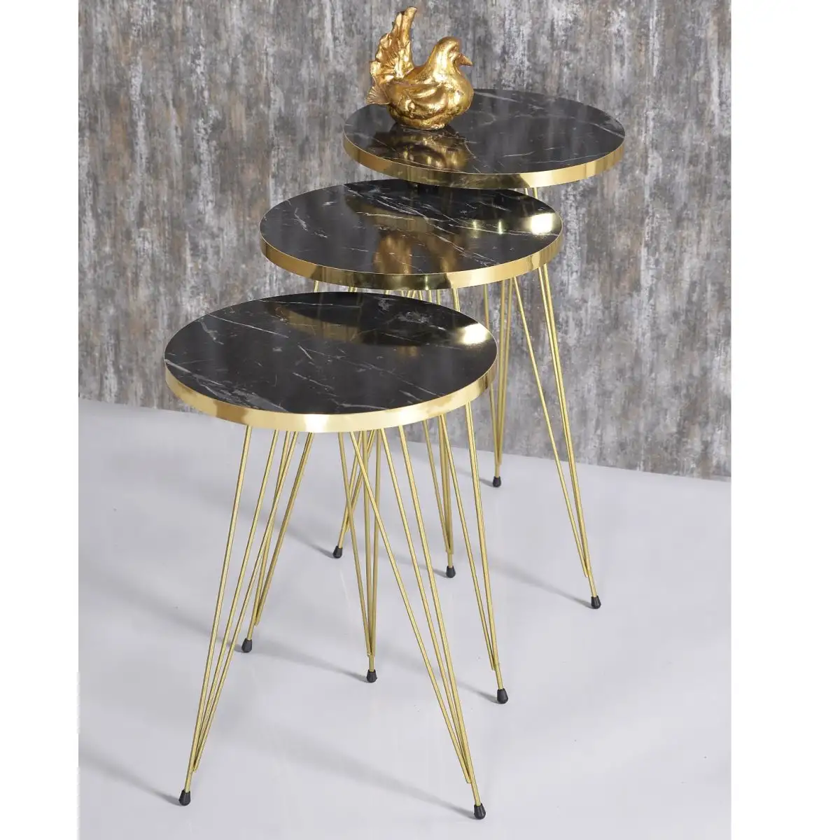 Adaugă un plus de stil și funcționalitate spațiului tău cu setul de măsuțe de cafea Homs, format din 3 piese cu un design modern și sofisticat. Blatul negru elegant, combinat cu picioarele metalice aurii, conferă un contrast rafinat și un aspect contemporan care se potrivește perfect în orice living.