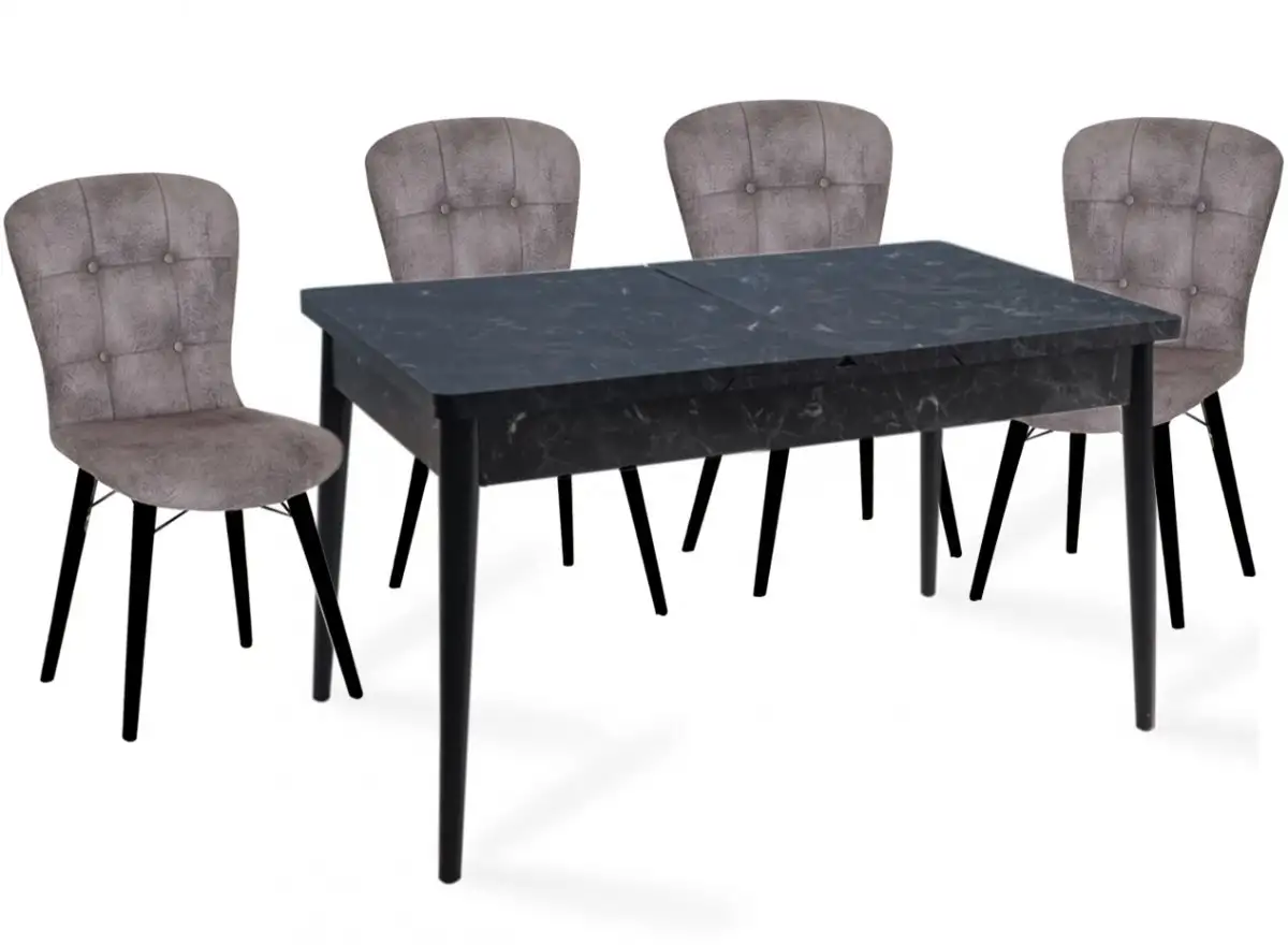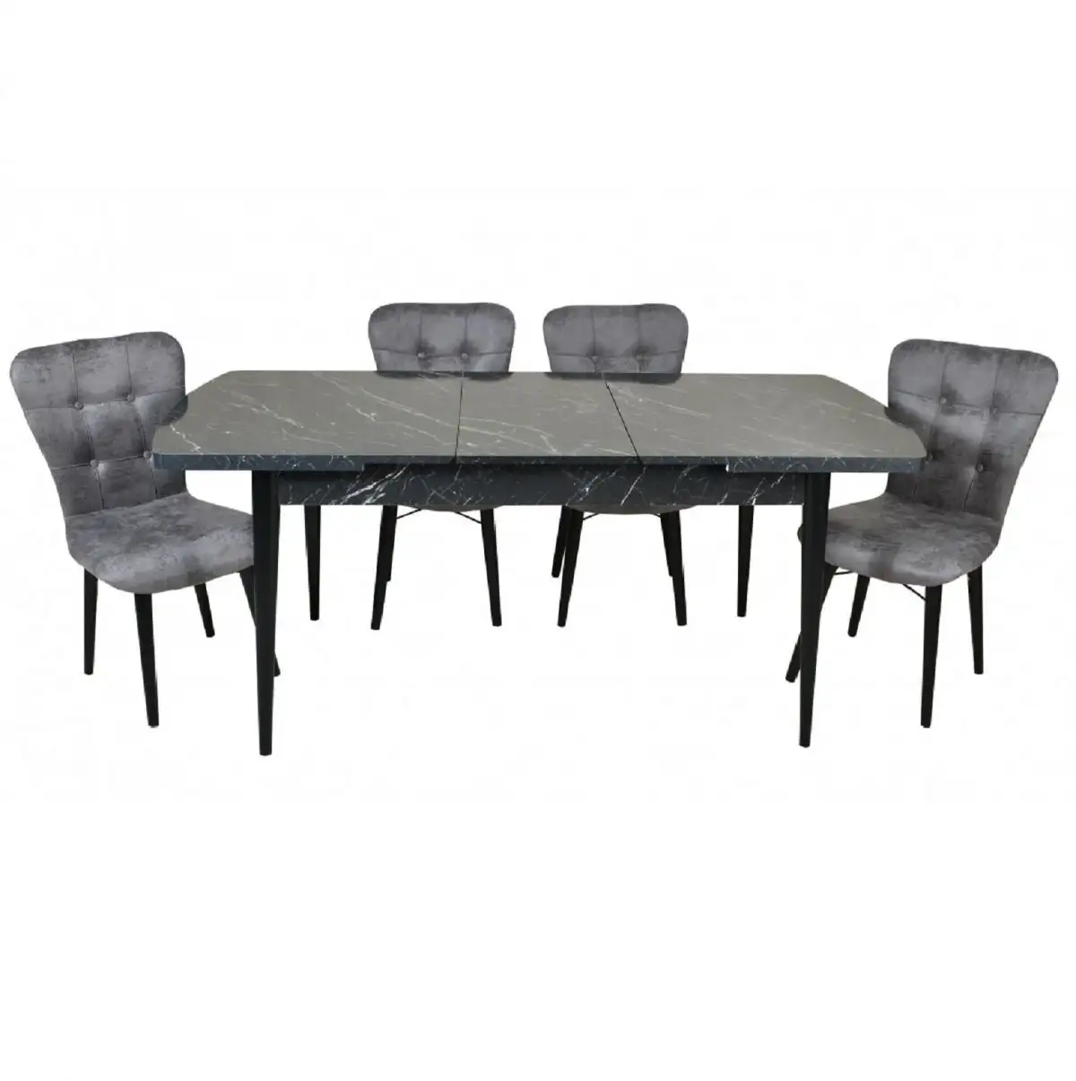 Set masa cu scaune format din masa extensibila si 4 scaune tapitate cu material textil. Setul este destinat pentru locul de servire al mesei, fie ca este vorba de bucatarie, living sau zona speciala de dining. Este un set modern, cu masa negru cu aspect marmorat  iar cele 4 scaune sunt tapitate cu material textil gri.