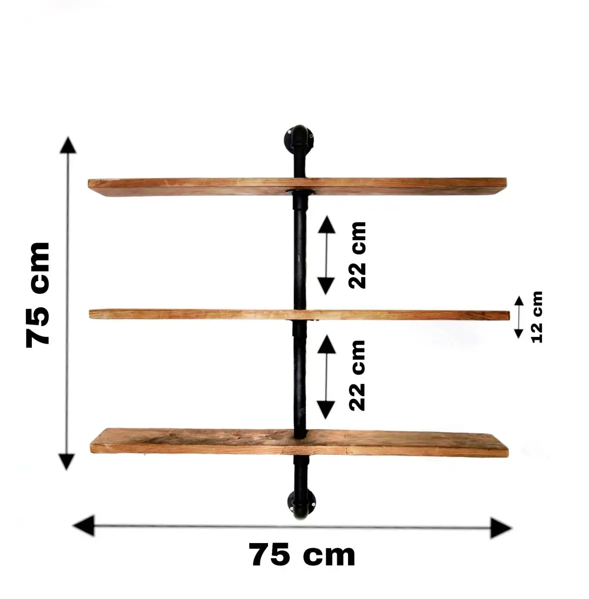 Decoreaza cu un raft cu 3 polite stil industrial din lemn-metal Homs 75 X 75 X 12 cm si bucura-te de un interior primitor si bine optimizat. Acesta este ideal in casele in stil industrial, birourile contemporane sau bistrourile ori barurile moderne. Structura pe baza metalica ii ofera o anduranta sporita, fiind completat de lemnul lucios. Lemnul e tratat sa reziste contra umezelii, putand fi amplasat si-n bucatarii sau spatii cu aburi.