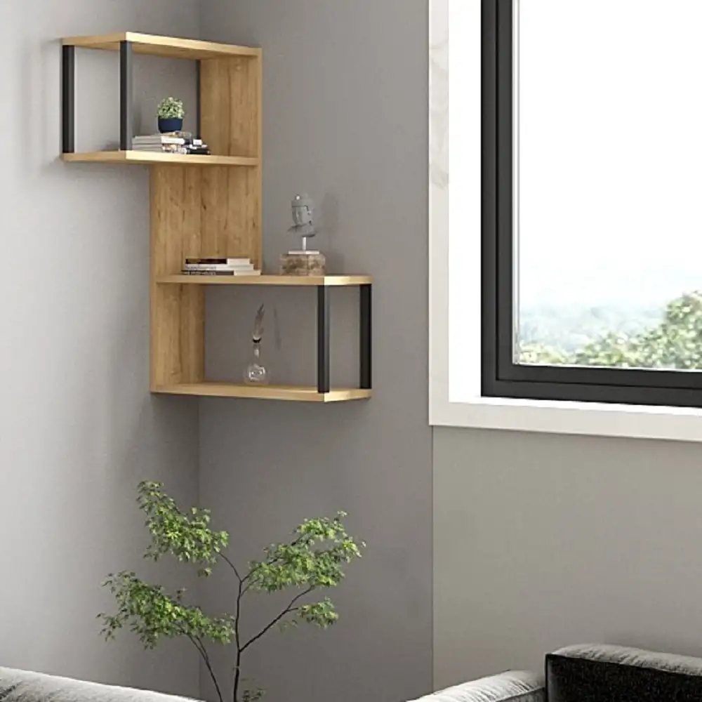 Raft de perete Lester pentru colt, culoare nuc si negru 84 cm