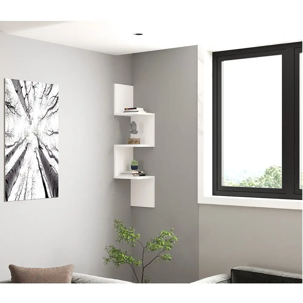 RAFT PE COLT NERA HOMS, ALB, 25 X 105.4 X 25 CM. Cu totii avem lucruri prin casa carora nu le gasim locul. Pentru a le aseza intr-un mod ordonat, insa fara sa ocupe mult spatiu ar fi bine sa profiti de spatiile moarte de pe colt si sa optezi pentru unul din rafturile de colt Nera. Raftul de colt Nera are un design modern ce atrage atentia fiind in acelasi timp o piesa practica. Poti depozita carti, rame foto, cosulete de rachita sau lemn cu diverse maruntisuri pe care nu le gasesti niciodata cand le cauti. Il poti folosi in living, in dormitor sau in camera copilului cu aceleasi rezultate de design si functionalitate. Raftul este realizat din pal de 18 mm culoare alb. Se livreaza neasamblat, impreuna cu accesorii asamblare si montaj pe perete. Montajul se realizeaza de catre beneficiar.Curatarea se face cu o carpa alba moale si produse de curatenie neabrazive. Dimensiuni L 25, l 25, h 105.4 cm
