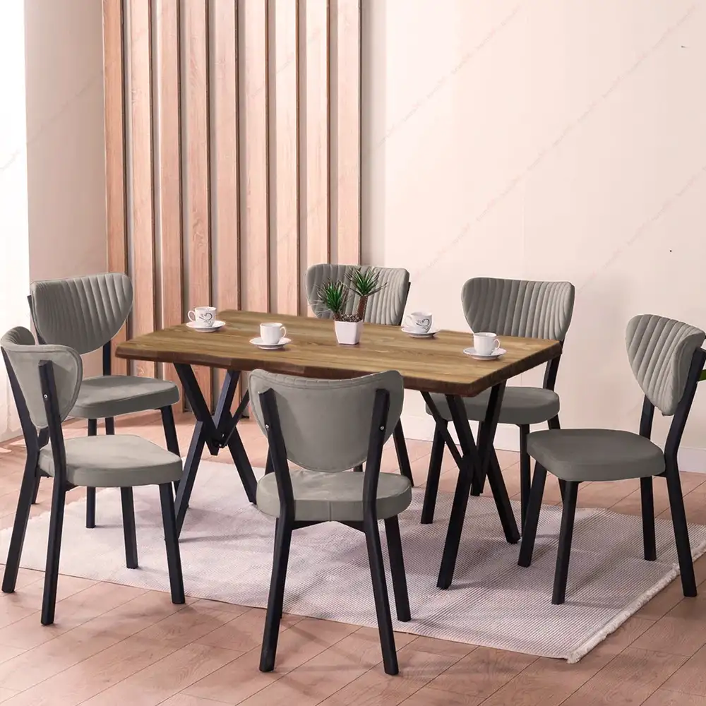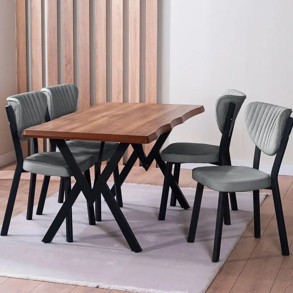 Set de dining elegant și funcțional, compus din masă cu blat MDF finisaj nuc și 4 scaune metalice tapițate gri. Ideal pentru bucătărie sau living – un mix reușit între design modern și confort.