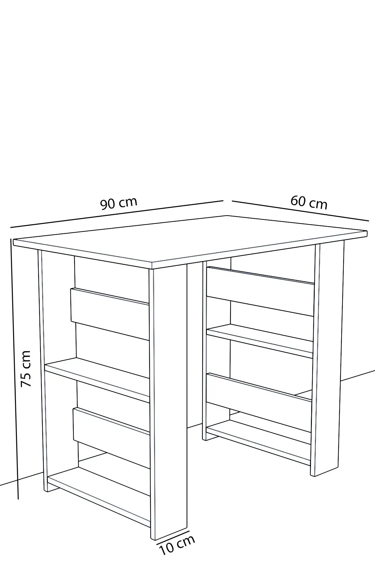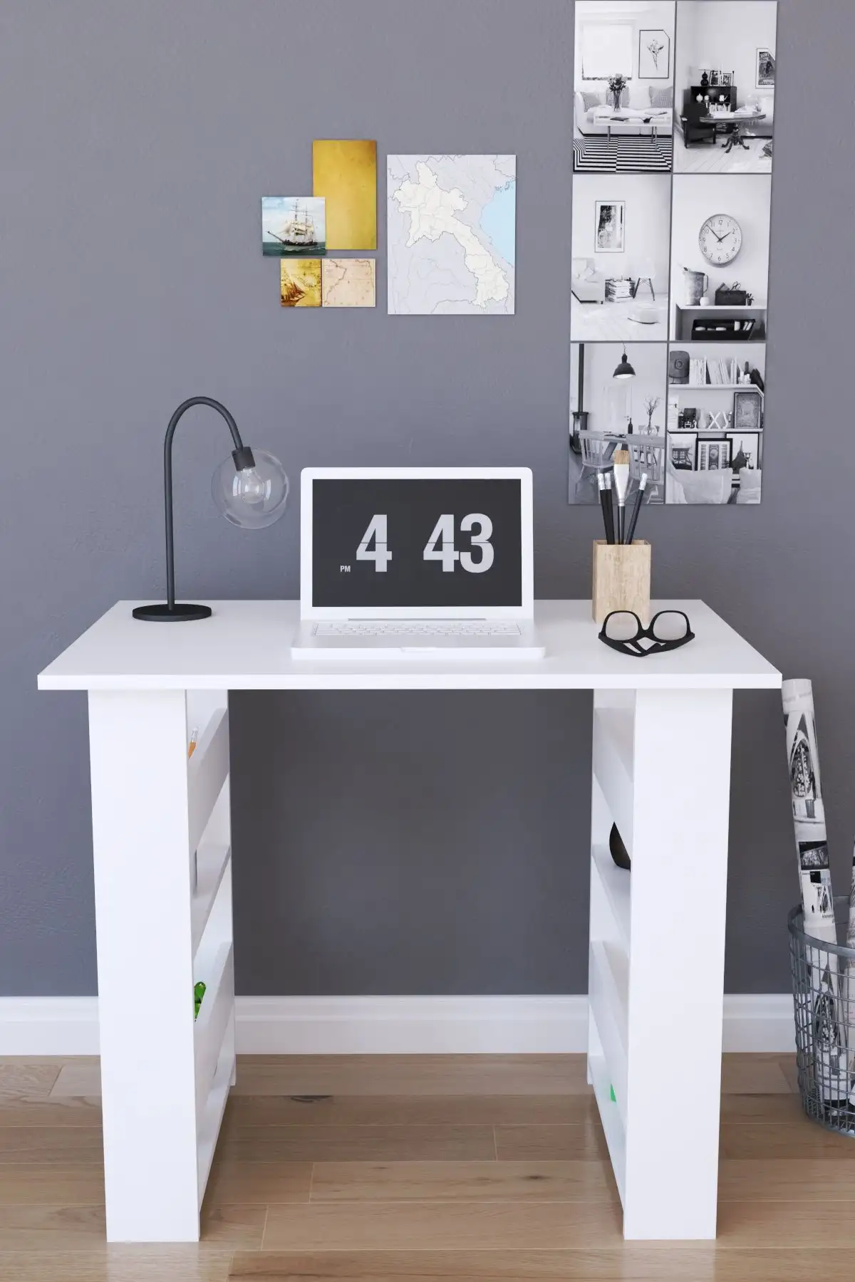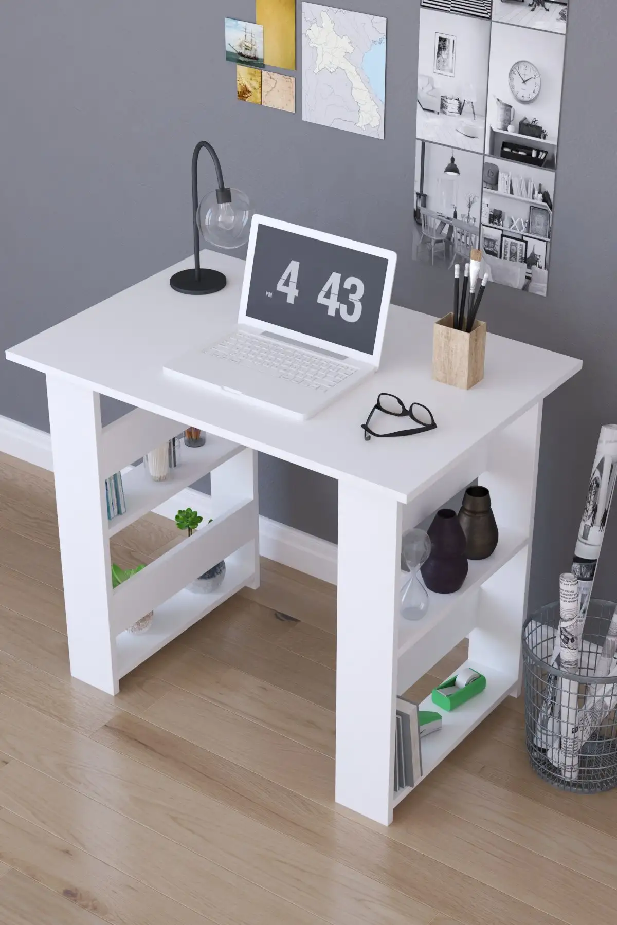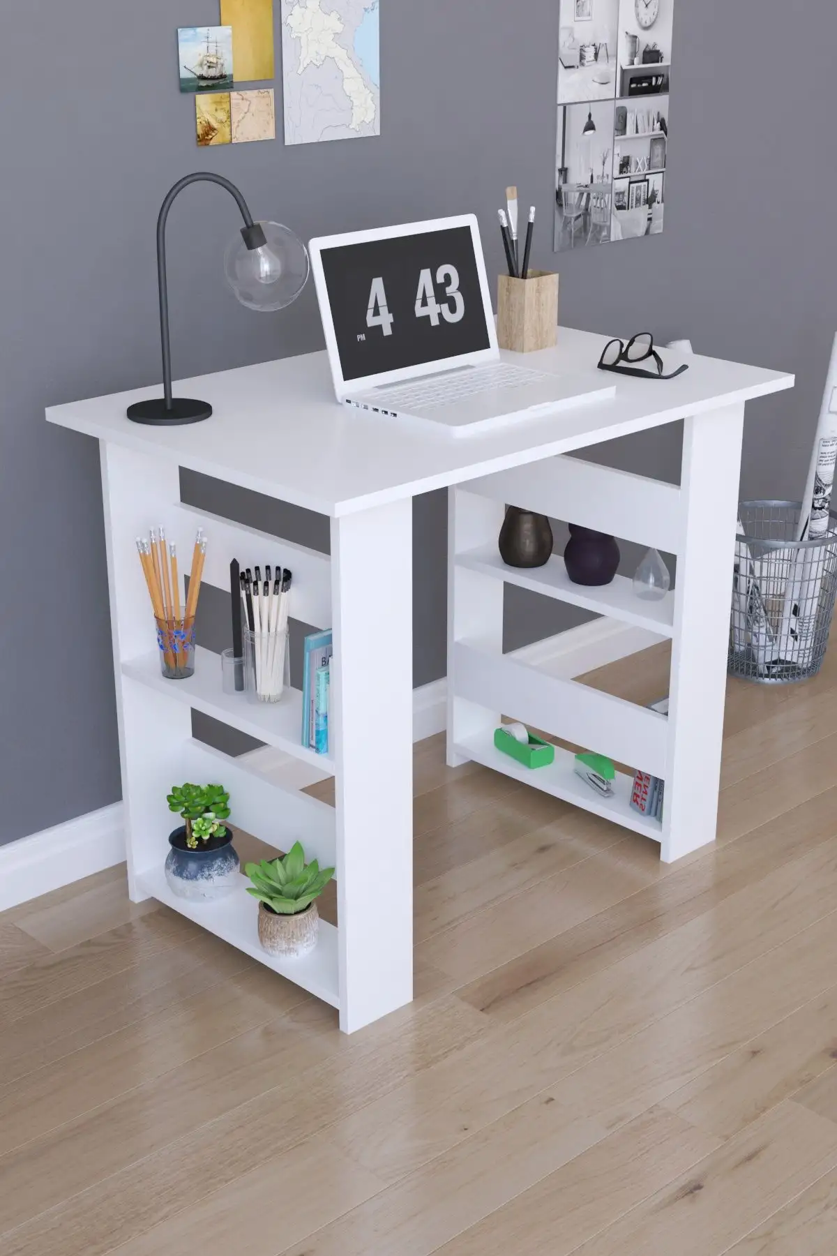 Birou pentru laptop cu rafturi pe lateral culoare alb.Biroul este potrivit ata pentru home office, cat si pentru o camera de copii.Nu ocupa mult spatiu si are un design simplu ,usor de integrat in orice decor.Nu aglomereaza vizual, ina este frumos si util compartimentat cu cate 2 polite pe lateral.