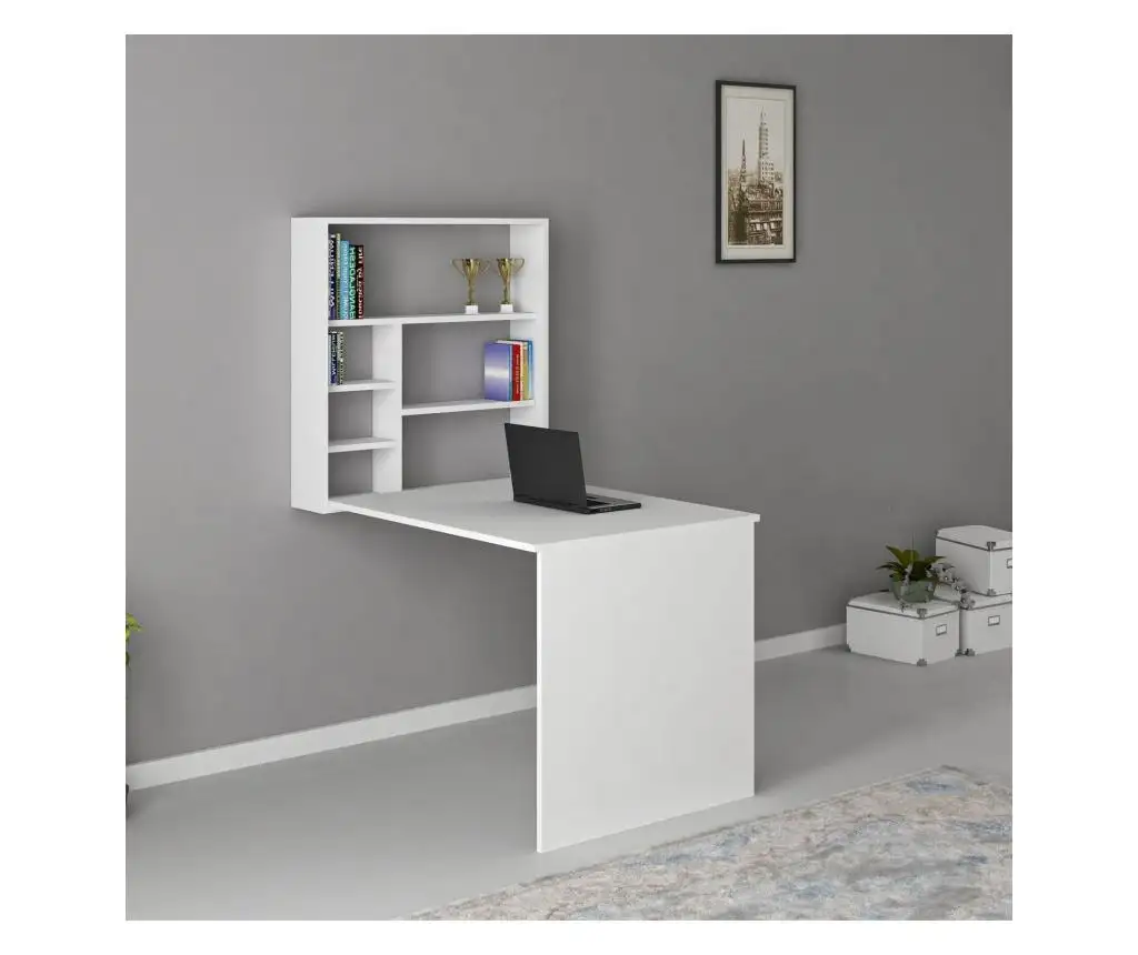 Birou suspendat perete realizat din pal de 18 mm culoare alb. Este o piesa de mobilier functionala, ideala pentru camerele mici sau pentru cele in care spatiul nu permite un birou normal.