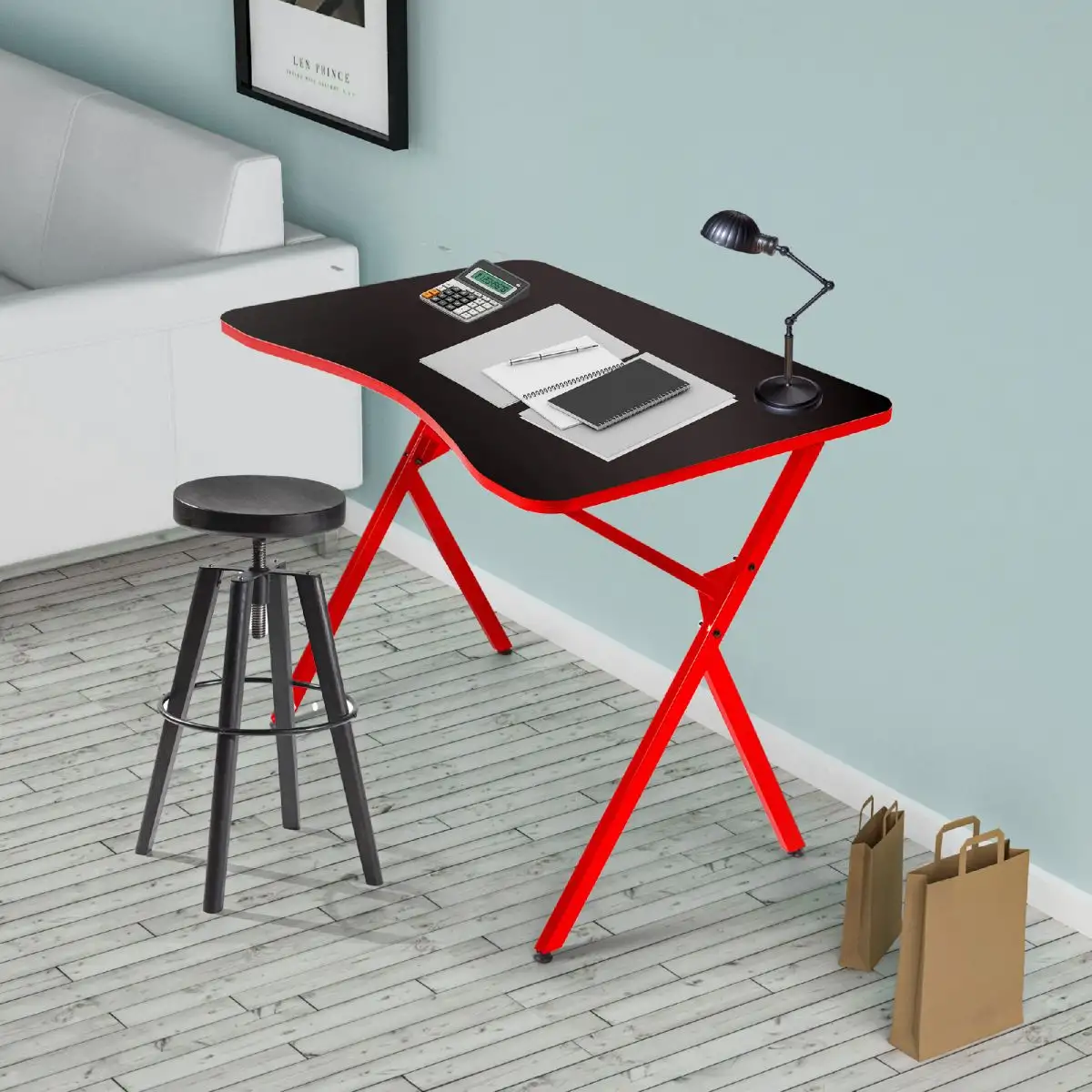 Biroul este realizat din cadru metalic vopsit rosu cu blat din pal de 18 mm culoare negru.