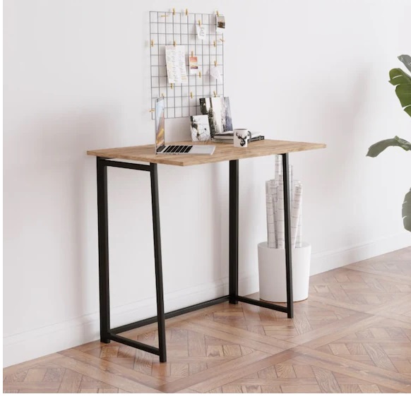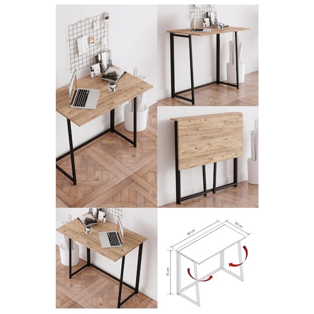 Cu dimensiuni de L 80 x l 50 x h 75 cm, această masă pliabilă este alegerea ideală pentru bucătărie, birou sau hol. Cu picioare metalice durabile și un blat în nuanța caldă a lemnului, această masă completează estetica modernă a oricărui spațiu, adaugând totodată funcționalitate și practicitate.